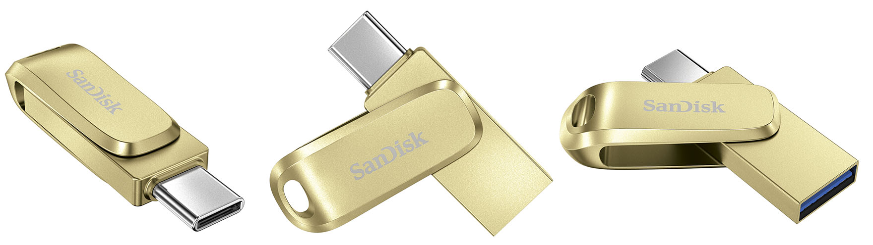 Ansichten des SanDisk Ultra Dual Drive Luxe Gold: Dank des Schwenkdesigns kann zwischen «USB Typ C»-Stecker (links) und «USB Typ A»-Stecker (rechts) gewechselt werden.
