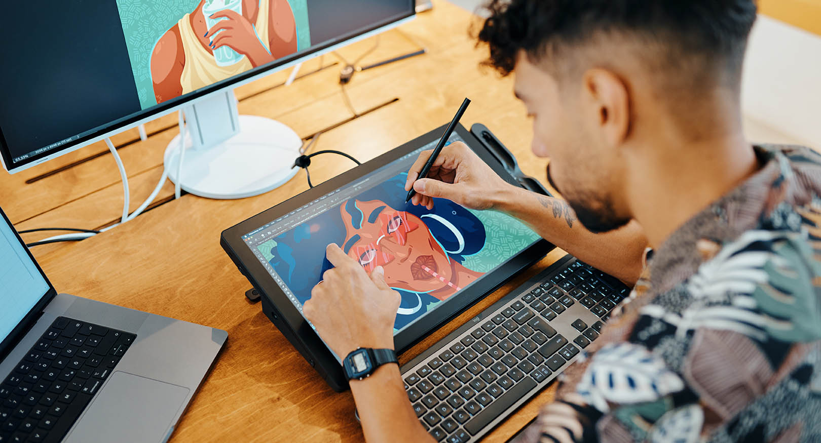 Im Kreativbereich sind die Stift-Displays – wie hier das Wacom Cintiq Pro 22 – unverzichtbar. Mit hochempfindlichem Stift und Tablet lassen sich äussert präzise und nuanciert Bilder mal und Fotos retuschieren sowie freistellen.