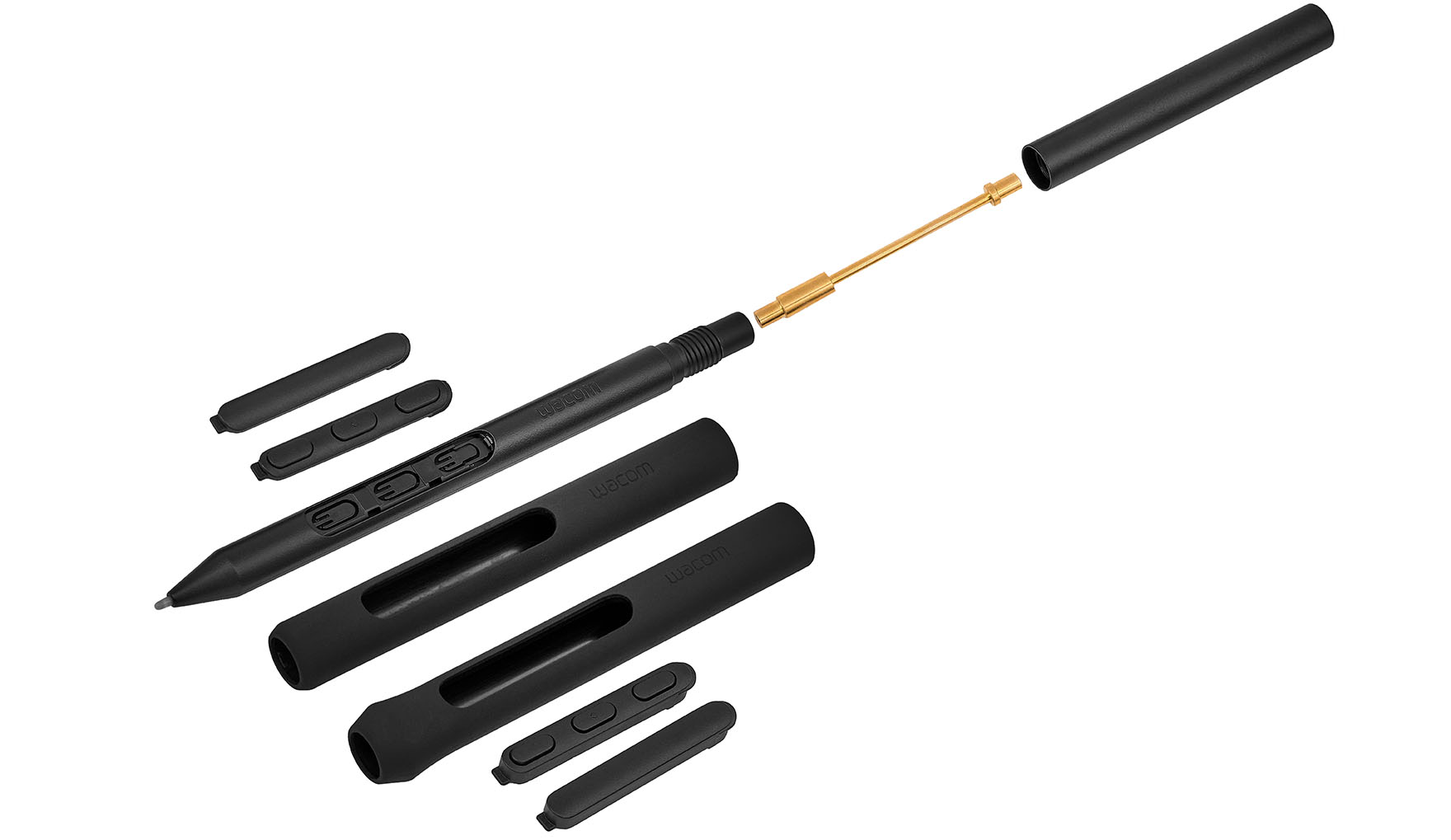 Der «Wacom Pro Pen 3»-Stift kann durch Zubehör angepasst werden. So kann er dicker gemacht oder sein Schwerpunkt mit einem inneren Gewicht verlagert werden.