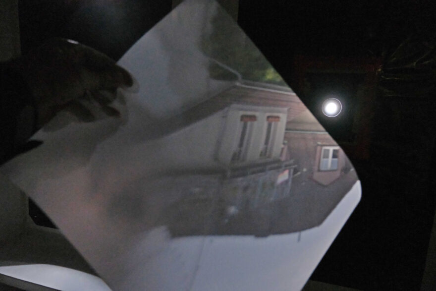 In der begehbaren Camera Obscura kann mit zur Verfügung gestelltem Mattpapier der Effekt der Lochkamera studiert werden. Warum steht das Bild auf dem Kopf und ist erst noch seitenverkehrt?