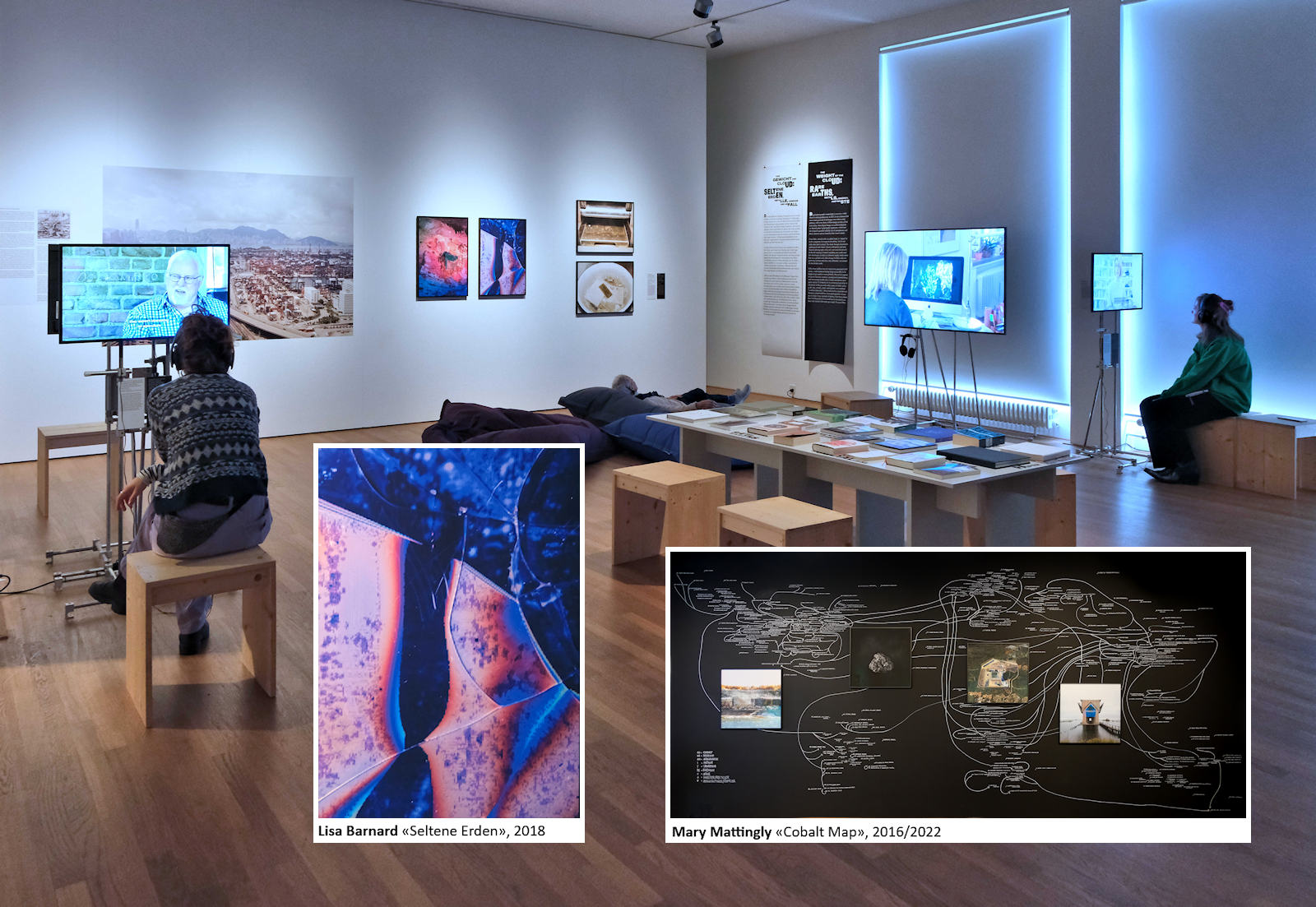 Es werden die Ressourcen thematisiert, die benötigt werden, um digitale Bilder zu produzieren, auszustellen und zu speichern. Der Abbau von Metallen der Seltenen Erden, die in unseren Smartphones und Datenspeichern zur Distribution von Bildern verbaut werden, verbraucht grosse Mengen Energie. Schliesslich landen die Seltenerdmetalle auf ständig wachsenden Bergen von Elektroschrott im globalen Süden, die ebenso schnell anschwellen wie der Hunger nach neuen Geräten. Den Aspekt des Recyclings behandelt Lisa Barnard in ihrem forschungsbasierten Werk «The Canary and the Hammer» über das Edelmetall Gold. Mary Mattingly verfolgt in einer wandgrossen Kreidedarstellung die komplizierten, oft undurchsichtigen Lieferketten von Kobalt, die sie kartografiert und deren Abbild sie fortwährend an das Marktgeschehen anpasst. Lisa Rave widmet sich in ihrem Videoessay dem Seltenerdmetall Europium.