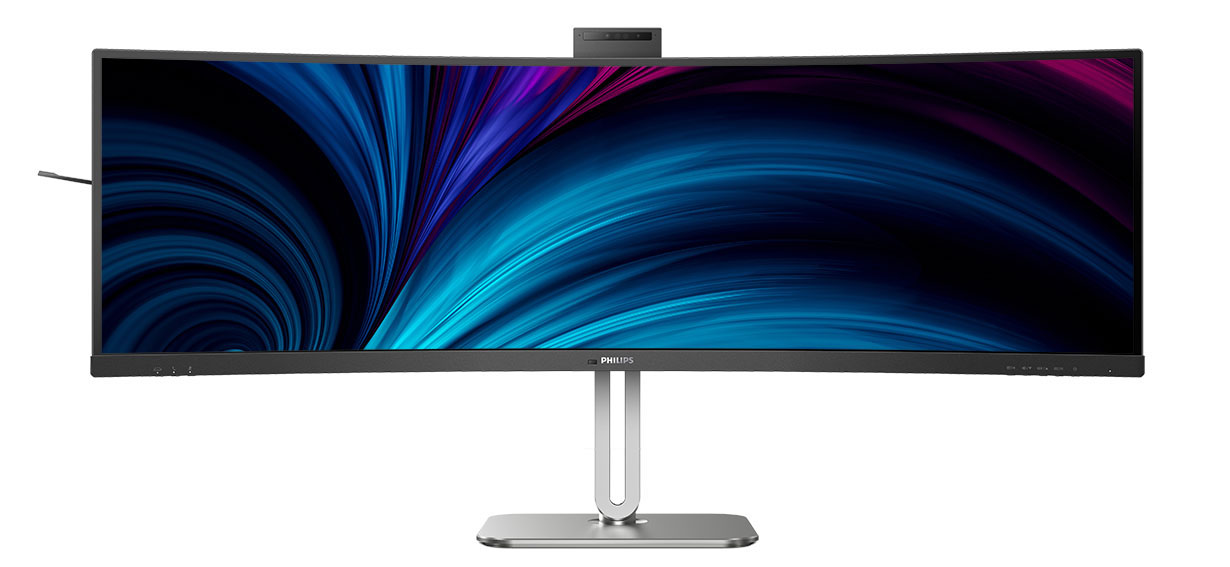 Komplett für das kollaborative Büro: Der 48,8″ Philips 49B2U5900CH verfügt über ein neues, zweifarbiges Design mit Busylight, eine 5-Mpx-Webcam mit Windows Hello und einen Headset-Halter (heraus ziehbarer Haken auf der linken Seite)