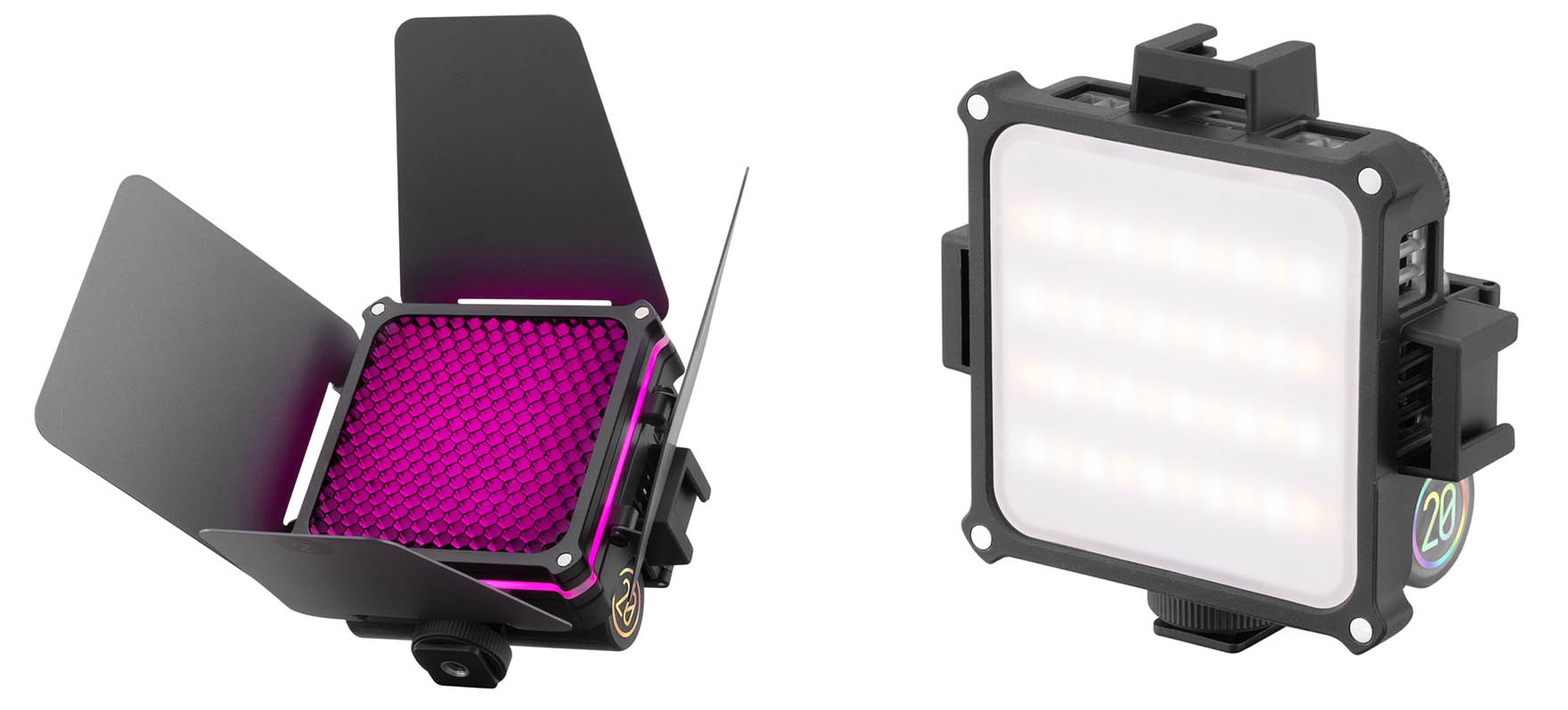 Beide Produkte sind in zwei Versionen erhältlich: das Standardpaket und das Combo-Paket. Die Standardversion enthält alles Wesentliche. Die Combo-Version enthält weiteres Zubehör wie einen Diffusor, Abschirmklappen, ein Wabengitter und eine Aufbewahrungstasche. Mit der beidseitigen Verlängerungshalterung und dem Blitzschuh, die in allen Paketen enthalten sind, kann der Benutzer einzelne Zubehörteile anbringen oder Kombinationen für diffuses, fokussiertes oder kreativ geformtes Licht erstellen.
