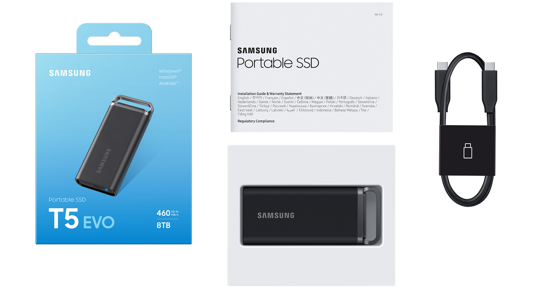 So wird die Samsung T5 EVO geliefert: vlnr. Packung, Manual, SSD und USB-Kabel (C-zu-C)