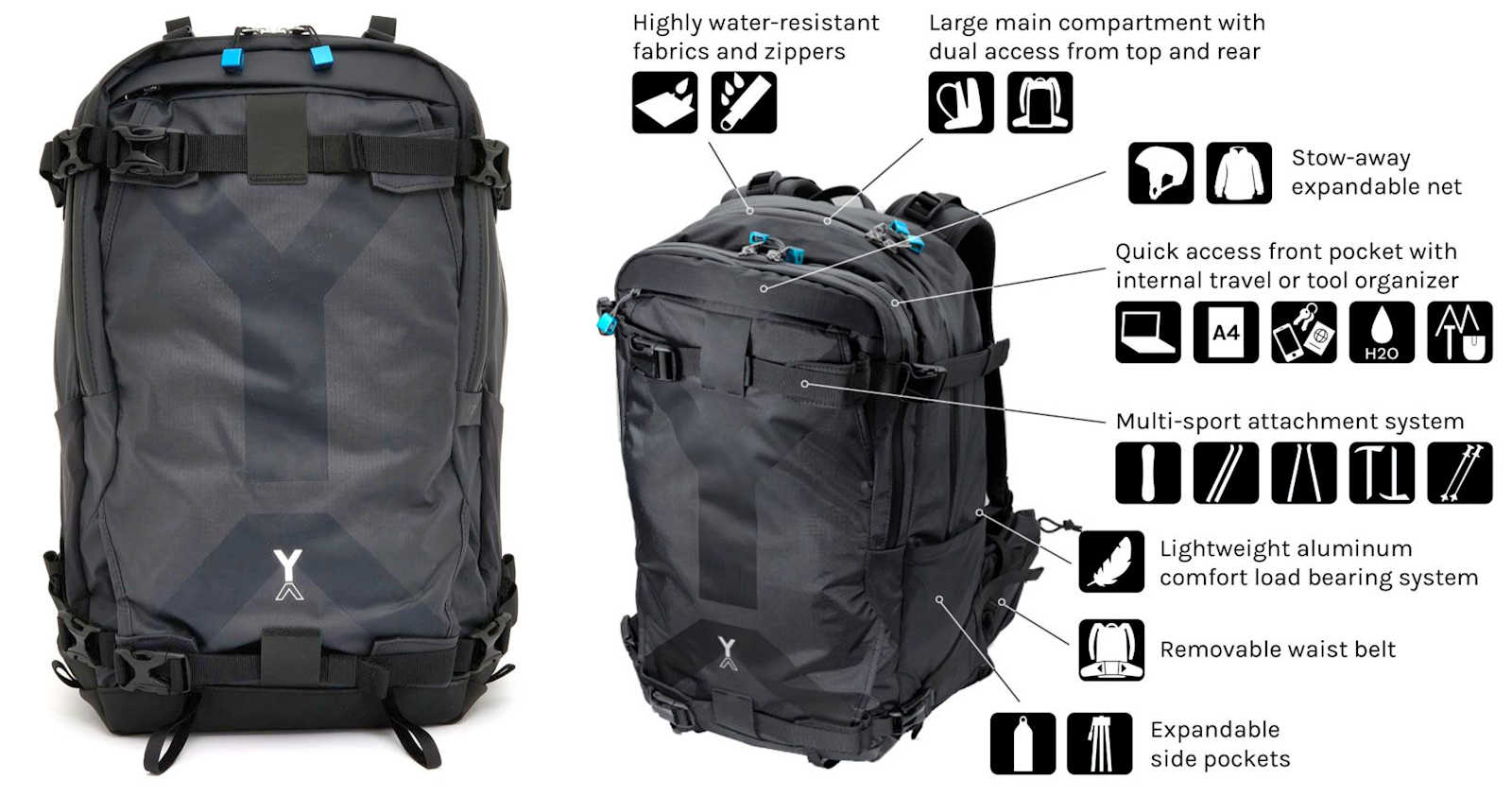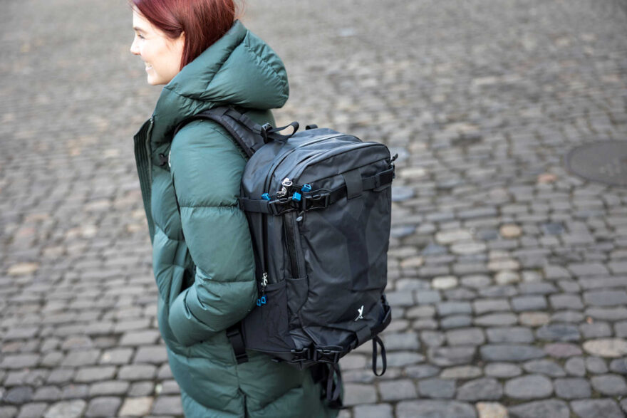Das Hauptfach ist von hinten und oben zugänglich. Daneben bietet der Rucksack eine schnell zugängliche Vordertasche mit internen Organisationsfächern für kleines Kamerazubehör (Speicherkarten, Filter usw.). Zudem gibt es Platz für die meisten 15-Zoll-Laptops sowie das 16-Zoll-MacBook-Pro-Laptop in die gepolsterte Hülle. An den Stretch-Mesh-Befestigungen, die an Schlaufen an der Aussenseite des Rucksacks angebracht werden können, lassen sich sperrigen Gegenständen wie Helme, Schlafsäcke, Jacken oder zusätzlichen Schichten befestigt werden.