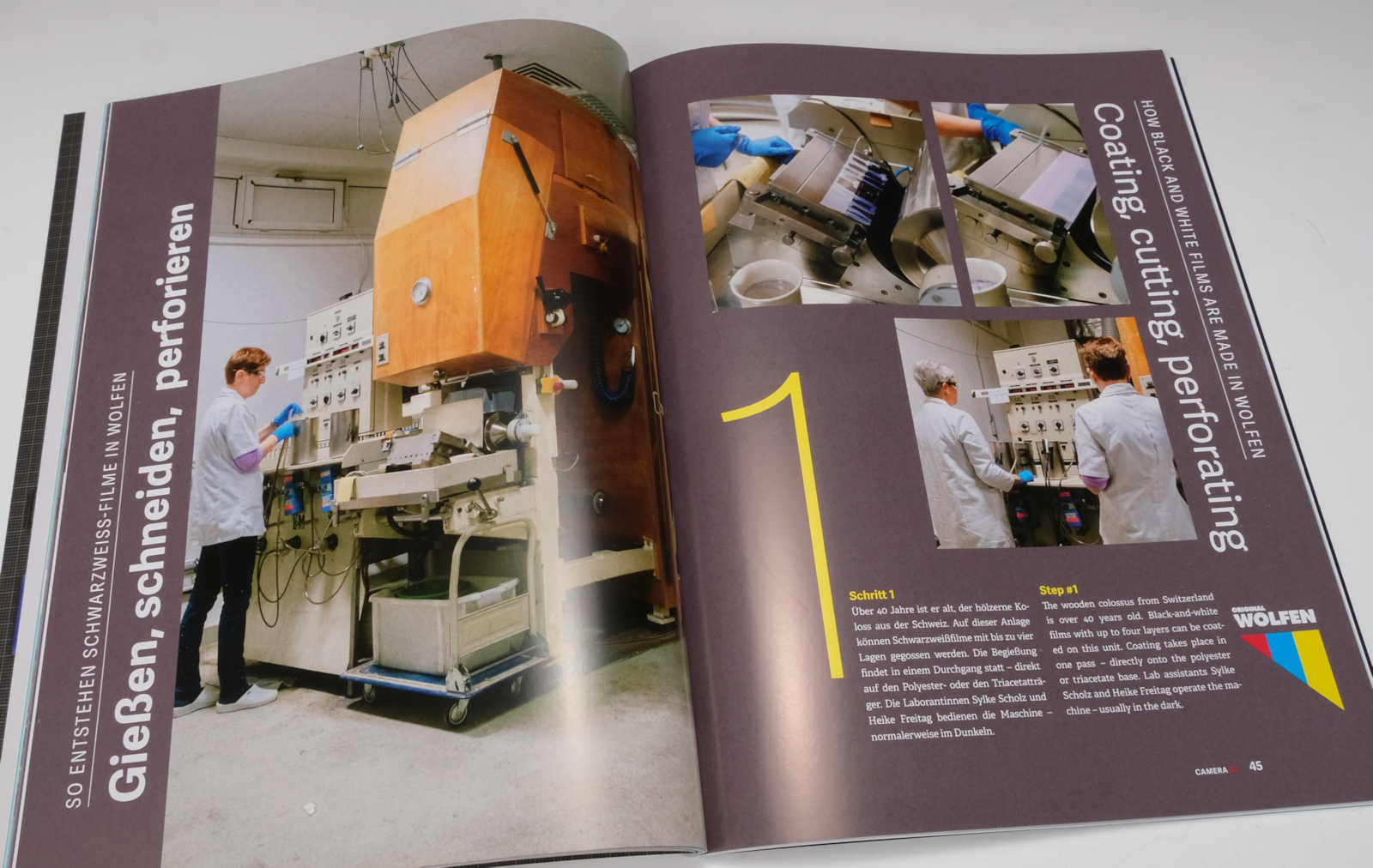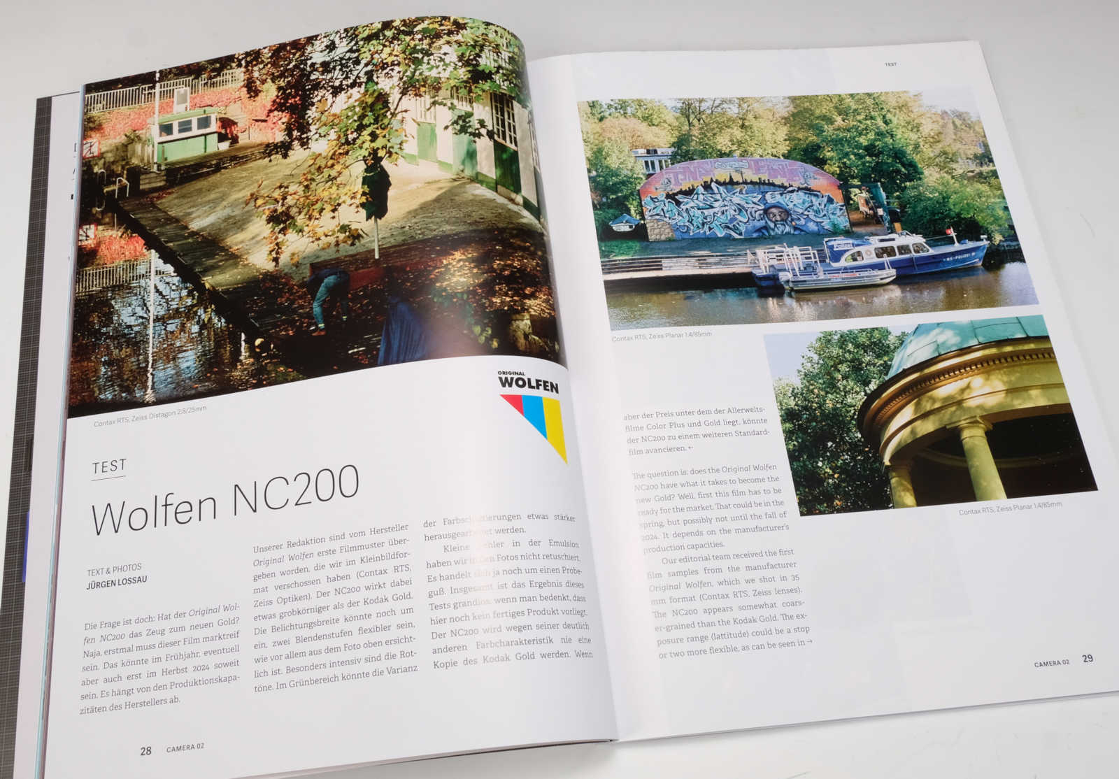Lossau ist ein geübter Blattmacher. Das sieht man den Texten, der Bildauswahl und der Aufmachung des Heftes an. Er geht auf viele motivierende Themen ein, und holt die Leserinnen und Leser dort ab, wo ihr Hauptinteresse liegt: bei der Fotografie mit Film. Dies leitet auch passend zum Schwerpunktthema dieser Ausgabe über: zu den neuen Filmen NC200 (Farbnegativ) und NC100 (Schwarzweiss) aus Wolfen. Neben den entsprechenden Erfahrungsbericht lädt das Heft die Leser/innen redaktionell zu einem Werkbesuch nach Wolfen ein, erklärt wie Filme begossen und konfektioniert werden und zeigt in einem spannenden Interview wo die Tücken der Filmproduktion liegen. Interessant, wie das ehemalige Knowhow von Orwo (und Agfa) wieder Fahrt aufnimmt und in Zeiten, wo Engpässe bei der Filmbeschaffung des Handels bestehen, voraussichtlich Rückenwind geniessen dürfte.