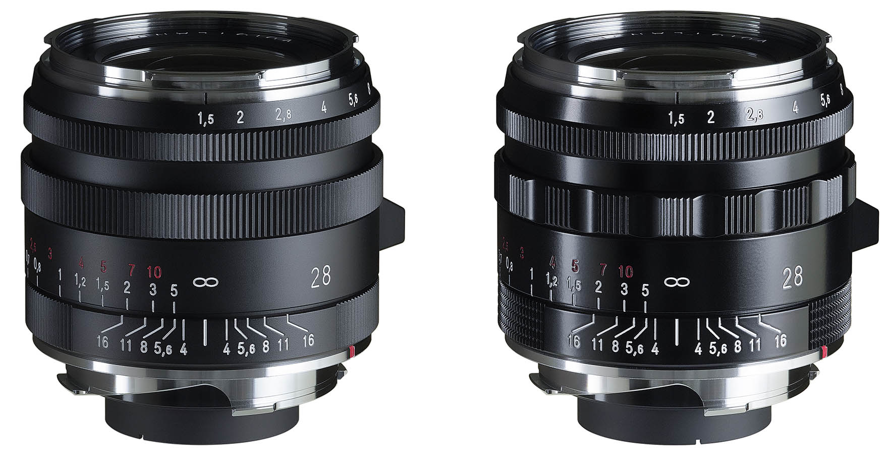 Voigtländer Nokton 1,5/28mm asphärisch: links als Typ I aus leichtem Aluminium und in einem moderneren, glatten Design und rechts als Typ II aus schwererem Messing im klassischen Design. (Beide gibt es sowohl in einer schwarzen als auch in einer silbernen Variante.)