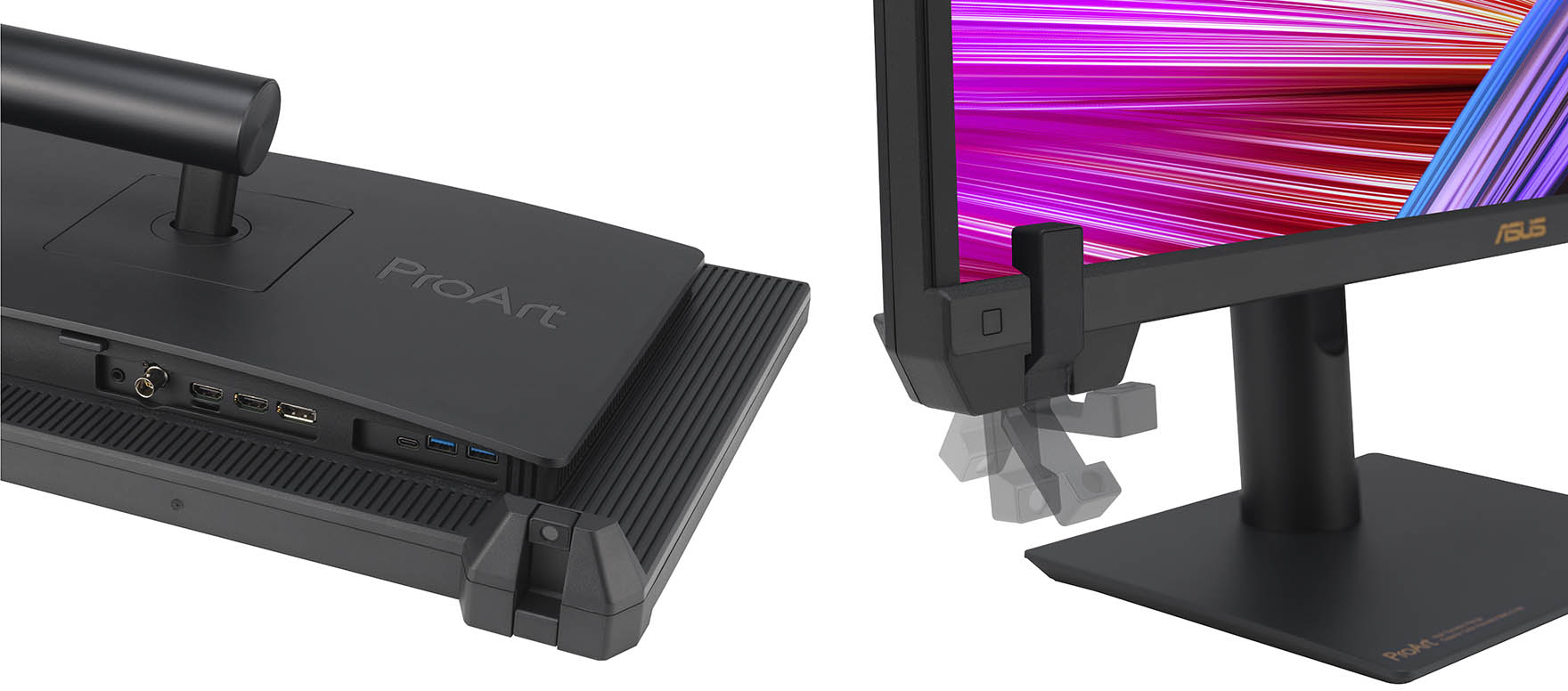 Details des Asus ProArt Display PA24US: Links sind die Anschlüsse zu sehen, rechts ist die das Ausklappen des Colorimeters zur Kalibrierung dargestellt.