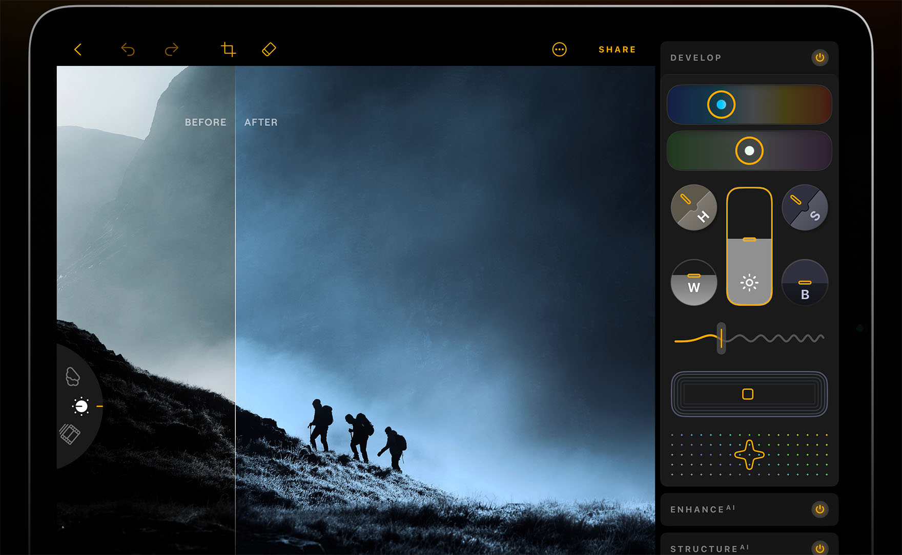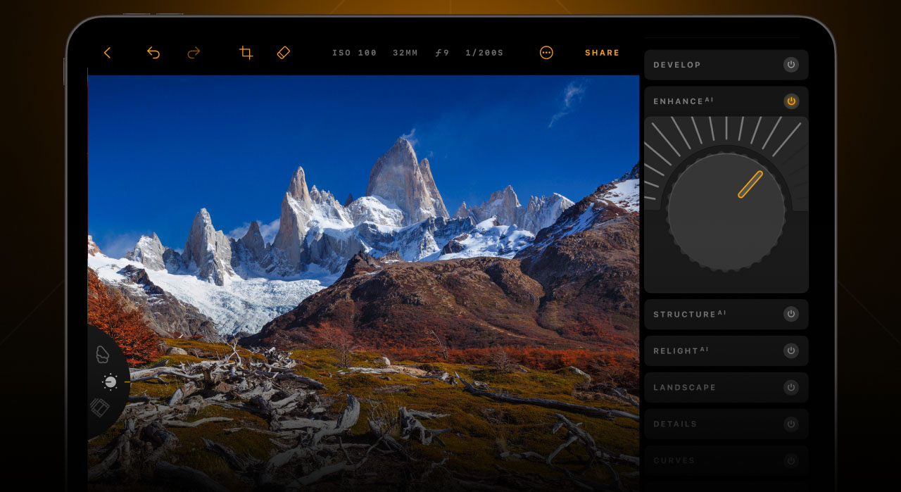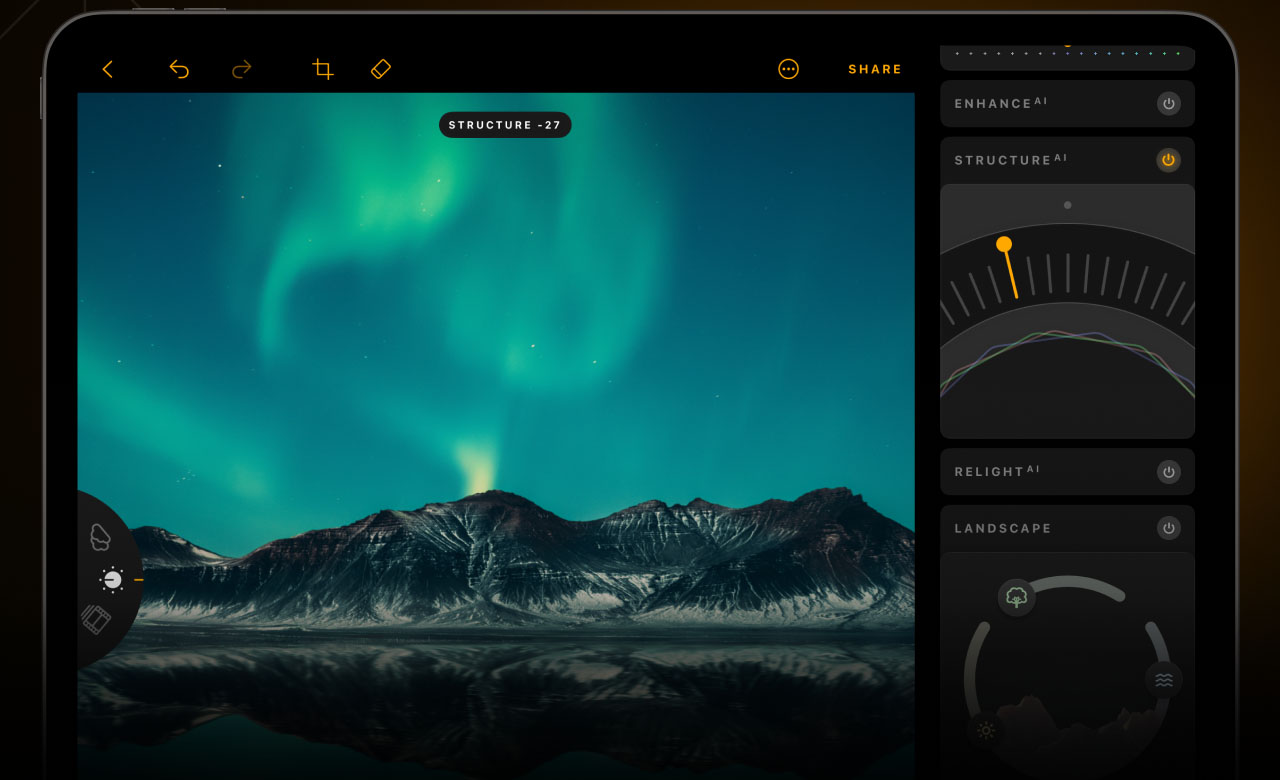 KI-gestützte Werkzeuge: Luminar für iPad enthält die Verstärken AI (eng. Enhance AI), die Himmel AI (eng. Sky AI), die Struktur AI (eng. Structure AI) und die Aufhellen AI (eng. Relight AI).
