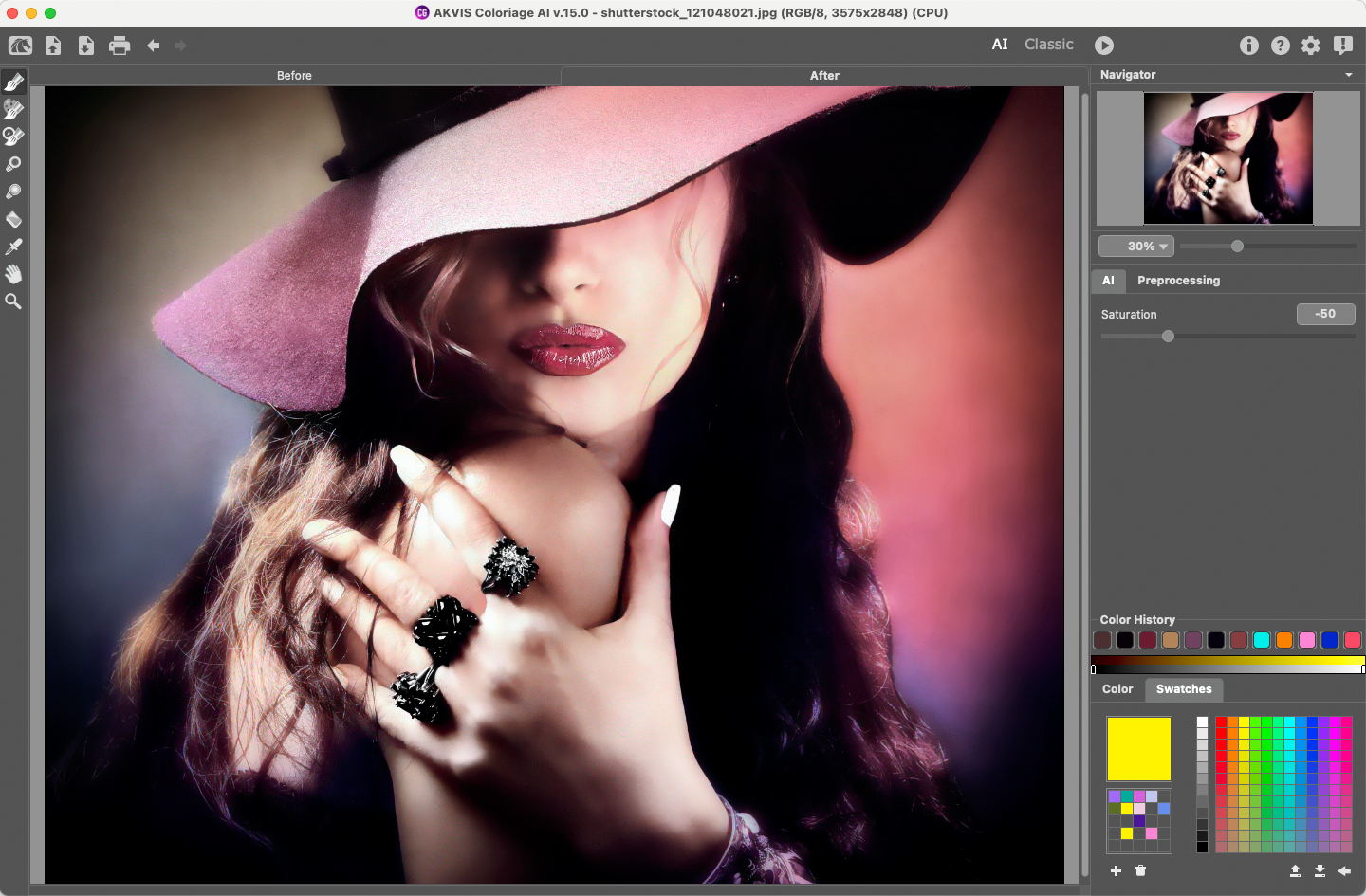 Das Programm, das nun in Version 15 vorliegt, existiert effektiv und wird kontinuierlich weiter entwickelt. So brachte die im Sommer 2023 lancierte Versionen 14 als neue Funktion eine Möglichkeit, um Musterbilder zu laden und als Vorlagen für das Um- oder Einfärben zu nutzen. Jetzt im Version setzt Akvis bei dem Programm ganz trendig auch auf künstliche Intelligenz, was durch den Namenszusatz «AI» (Articial Intelligence) ausgedrückt wird. Mit den im Update eingeführten fortschrittlichen Technologien können Benutzer Fotos mit einem Mausklick einfärben. Die neue Version nutzt künstliche neuronale Netze und maschinelle Lerntechnologien zur Fotokolorierung. Das Update bietet ausserdem neue Nachbearbeitungstools und weitere Änderungen.