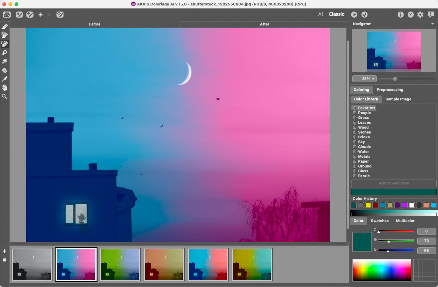 Im AI-Modus verwendet die Software ein trainiertes neuronales Netzwerk, das Kanten in Schwarzteilfotos genau erkennt und Farben so realitätsnah wie möglich anwendet. Im Gegensatz zu vielen anderen KI-Kolorierungstools und -diensten, ist für Coloriage AI keine Internetverbindung erforderlich. Die Software funktioniert im Vollfunktionsmodus, sowohl im Testzeitraum als auch unter der lebenslangen Lizenz.