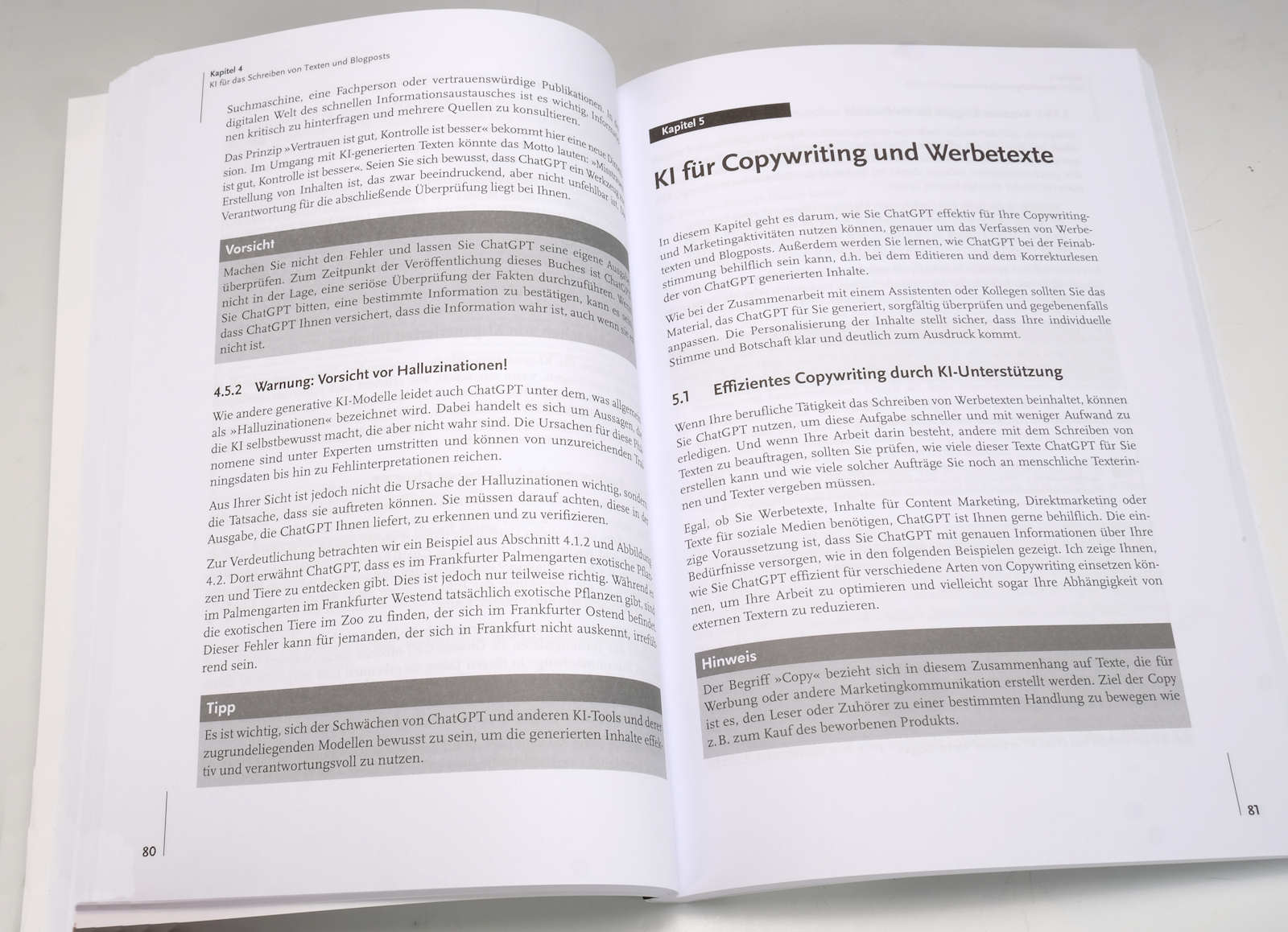 Erstellen eines Texts / Sachliche Ausgabe durch einfachen Prompt / Zielgerichtete Ausgabe durch ausführlichen Prompt / Konzipieren und Erstellen von ansprechenden Überschriften, Gliederungen und Artikeln / Schritt 1: Thema finden / Schritt 2: Titel schreiben / Schritt 3: Gliederung erstellen / Schritt 4: Überschriften formulieren / Schritt 5: Abschnitt für Abschnitt schreiben / Schritt 6: Tabellen erstellen / Schritt 7: Einleitung und Fazit schreiben / Wie geht es weiter? / Wiederkehrende Informationen als Custom Instructions hinterlegen / Das begrenzte Gedächtnis von ChatGPT / Mit Custom Instructions dem Gedächtnis auf die Sprünge helfen / KI-gestützte Textverbesserung mit DeepL Write / Überblick und Funktionsweise / Anwendungsgebiete von DeepL Write / Kritische Betrachtung / Schwächen von KI-generierten Inhalten / Evaluierung der Ausgabe von ChatGPT / Warnung: Vorsicht vor Halluzinationen!