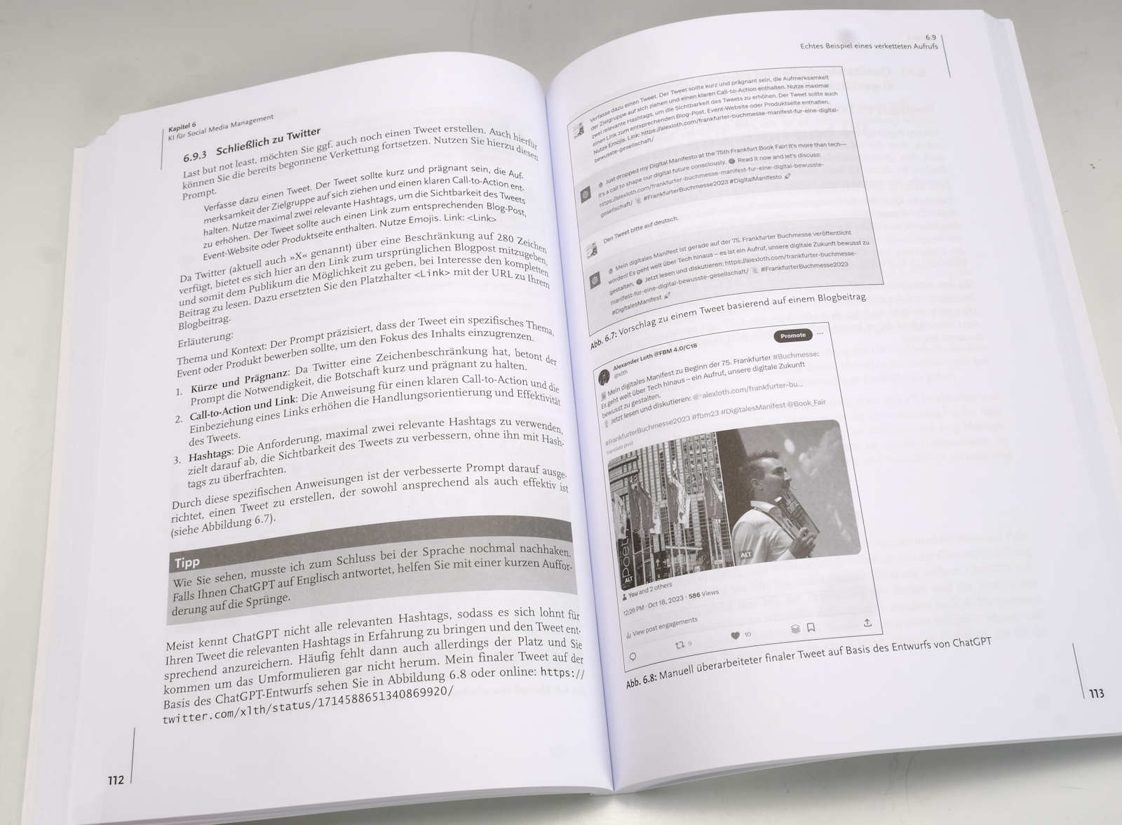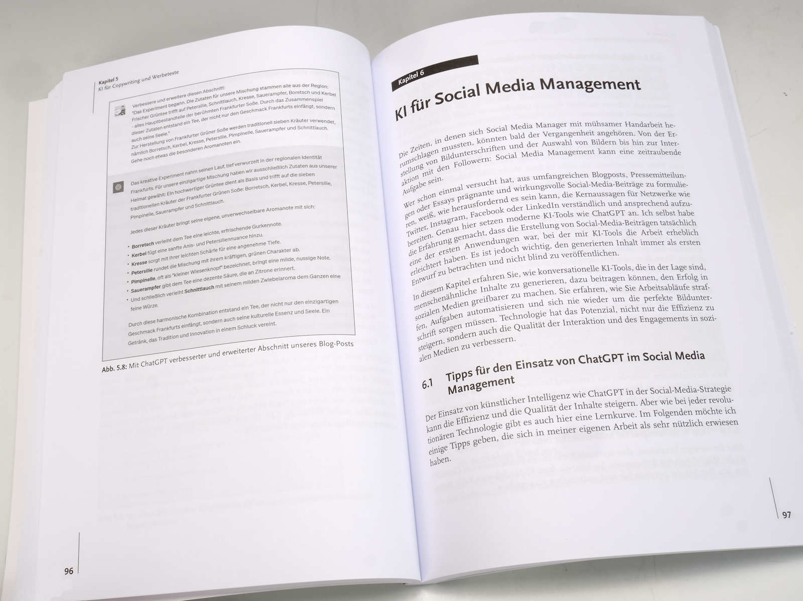 Das Buch stellt in den ersten drei Kapiteln die grundlegenden Funktionen und Fähigkeiten der KI für das Erstellen von KI-Anwendungen vor und geht dann mit verschiedenen Fallstudien und Anwendungsbeispielen in einem praktischen Teil über. Das vierte und fünfte Kapitel dürfte vor allem für Textautoren und Blogschreibende wichtig sein, nicht zuletzt, weil ein KI-generierter Text eine nützliche Grundlage für die kreative Eigenentwicklung sein kann. Im sechsten Kapitel geht es um Social Media Management, während sich Kapitel sieben mit den KI-Möglichkeiten in der Unternehmens- und PR-Kommunikation befasst. Im Kapitel wird das Potenzial im Bereich der Suchmaschinenoptimierung aufgezeigt. Kapitel neun schliesslich spricht besonders Bildkreative an, die mit KI Bildteile in ihre Fotos und Videos einbauen oder die Bildinhalte völlig mit Künstlicher Intelligenz erstellen möchten. Das zehnte Kapitel zeigt die Möglichkeiten von KI bei Audio-Inhalten auf, was auch für Videoschaffende wichtig ist, welche die Einsatzmöglichkeiten von KI im elften Kapitel vorfinden. Die beiden letzten Kapitel sind für mich die Wichtigsten im ganzen Buch, weil sie sich mit der Ethik von KI-generierten Inhalten und den zukünftigen Trends und Entwicklungsmöglichkeiten von KI befassen. Hier zeigt der Autor interessante und ungeahnte Perspektiven auf, die uns klar machen, dass das Wissen um die Künstliche Intelligenz für alle wichtig ist – ob wir KI nun (wissentlich) praktisch anwenden wollen oder nicht.