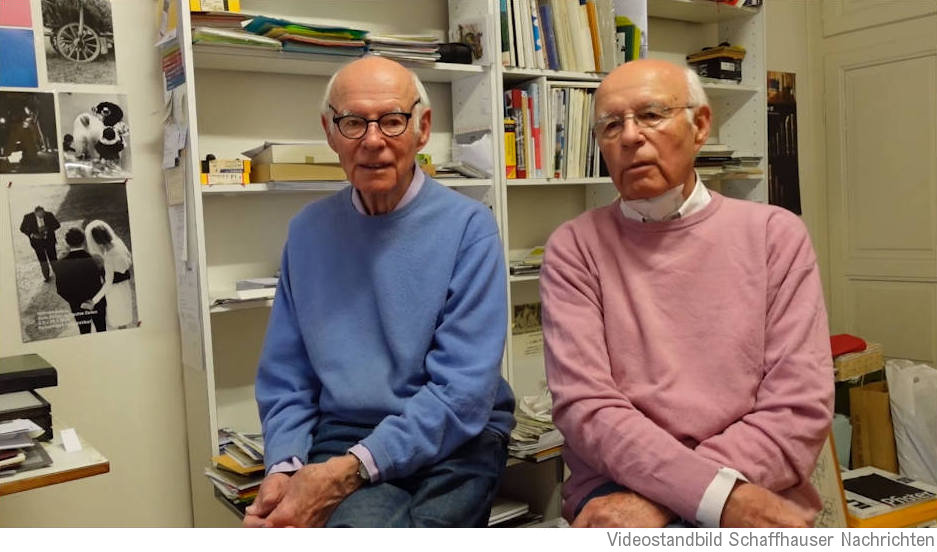 Bruno (links) und Eric Bührer im Video der Schaffhauser Nachrichten zu ihrem 85. Geburtstag am 13. März 2021
