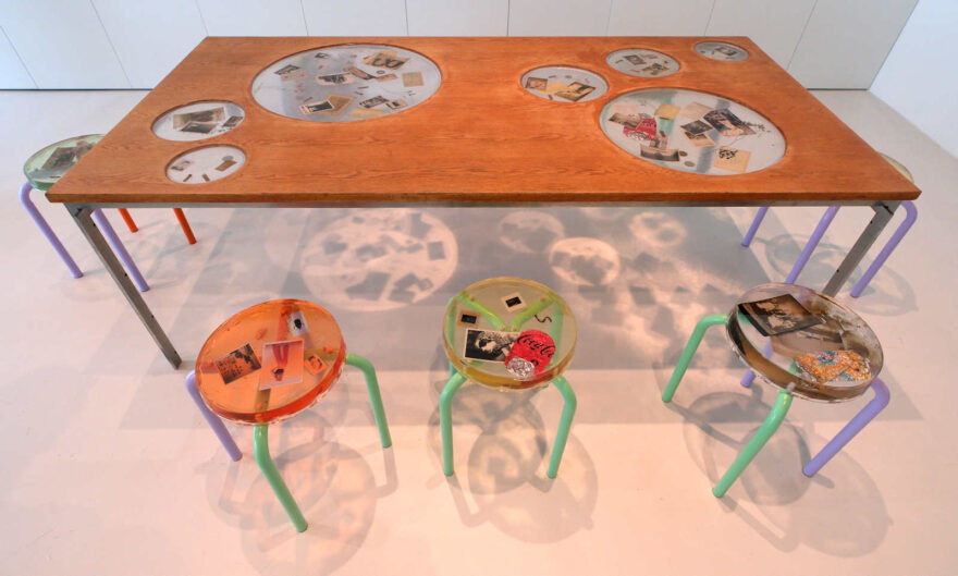 «Inclusions» ist eine Sammlung von Möbeln und Klassikern des Designs, die Thomas Mailaender mit Hilfe von Bildern neu interpretiert und so ausrangierte Gegenstände zu neuem Leben erweckt. Er benutzt Fotografien, Dokumente und Müll, die er auf dem Boden liegend oder auf Flohmärkten gefunden hat, welche er in Harzplatten eingiesst, die danach in Möbelstücke eingesetzt werden. Der französische Künstler ersetzt so die Platte des berühmten Le Corbusier-Tisches Corbusier LC6 oder er versieht die Sitzflächen des ikonischen Hockers von lkea und integriert dieses synthetische Material in das Holz eines Tisches von Poul Kjoerholm. Die in Harz eingegossenen Geschichten wecken in uns Erinnerungen, beflügeln unsere Fantasie und sollen Dialoge fördern und Reflexionen auslösen.