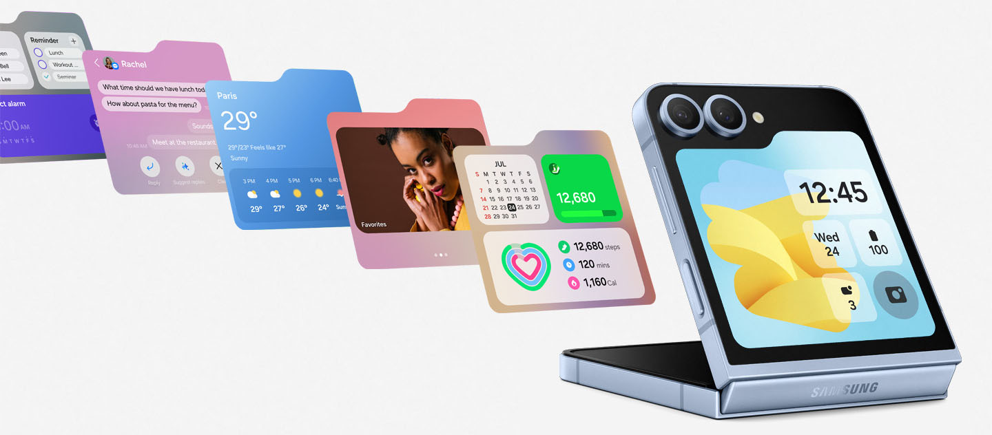 Auch die neueste Generation des Samsung Galaxy Z Flip steckt voller Innovationen und kreativer Möglichkeiten. Das 3.4-Zoll-Super-AMOLED-FlexWindow *14 Coverdisplay wurde weiter verbessert. Über Widgets ist es nun möglich, noch mehr Features direkt vom Coverdisplay aus zu bedienen. So können Nachrichten unterwegs ganz einfach mit Suggested Replies *15 beantwortet werden.