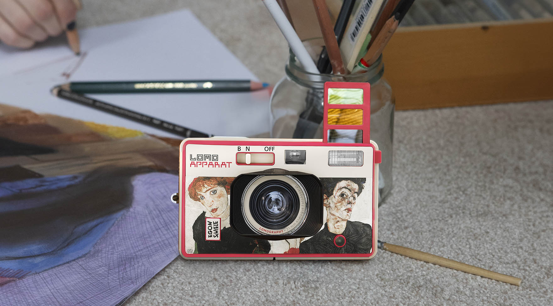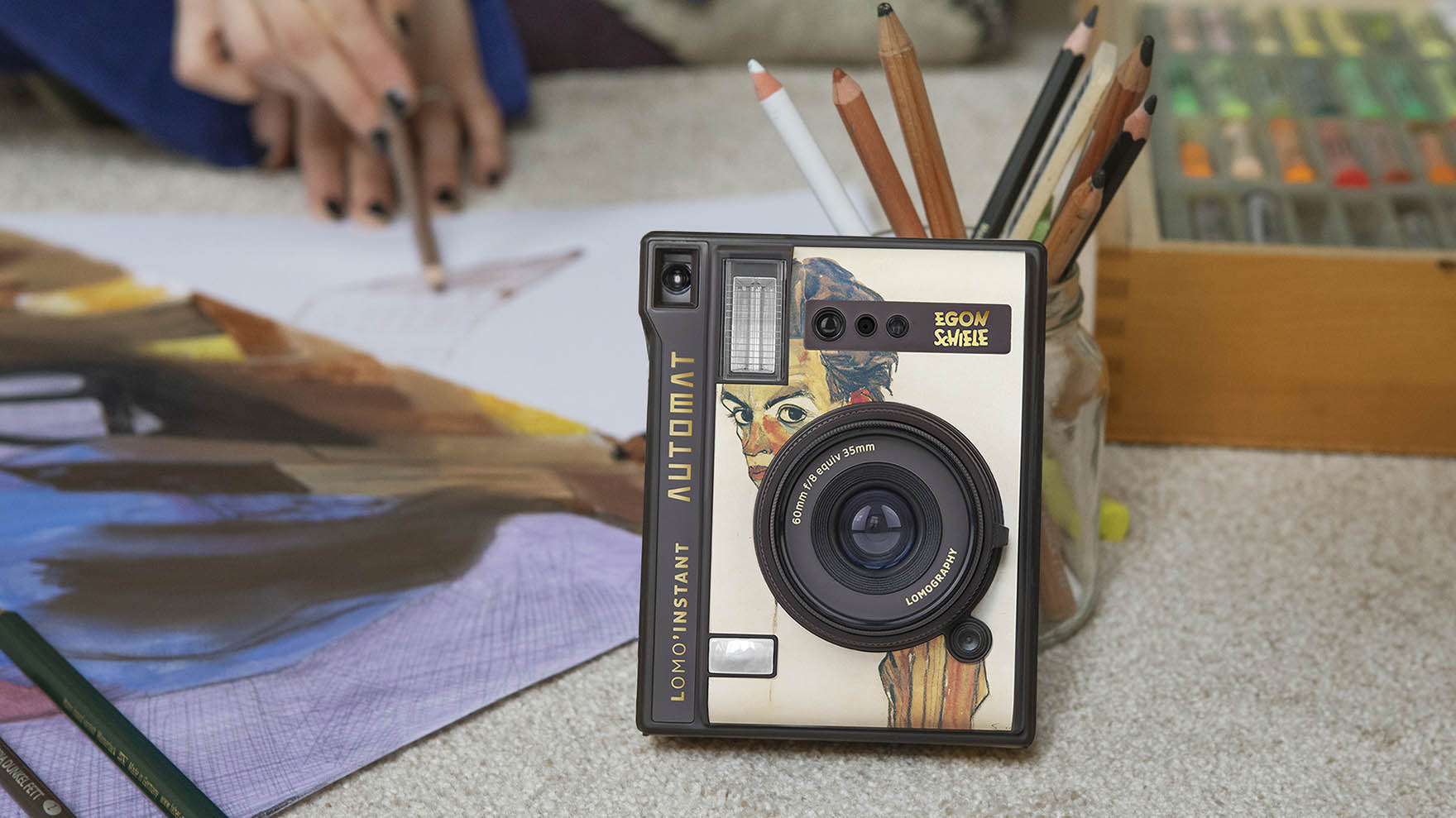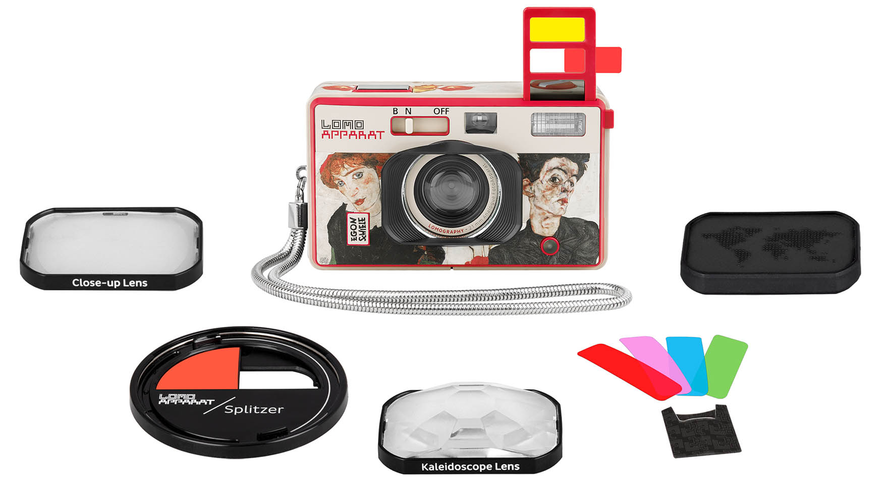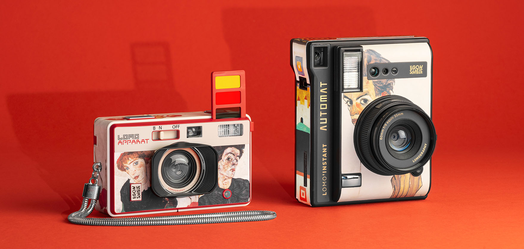 Dieses Kamera-Ensemble zeigt die Kunstwerke des visionären österreichischen Künstlers Egon Schiele auf neuen Editionen der Sofortbildkameras «Lomo’Instant Automat Camera & Lenses» und weitwinkligen Kompaktkamera für 35mm-Kleinbildfilm der «LomoApparat 21 mm».