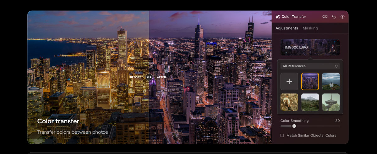Farbübertragung: Mit der Funktion, Farben von einem Referenzbild auf eigene Fotos zu übertragen, lassen sich beeindruckende Ergebnisse erzielen. Dabei können die Anpassungen bequem über Schieberegler vorgenommen werden, während die KI automatisch Farben zwischen ähnlichen Objekten, wie etwa zwischen zwei Himmeln oder zwei Autos, angleicht. Dies ermöglicht sowohl kreative Flexibilität als auch hohe Präzision. So lassen sich der Stil bzw. die Farbgebung eines (älteren) Fotos oder auch eines fremden, inspirierenden Bildes aus dem Internet nachbilden.