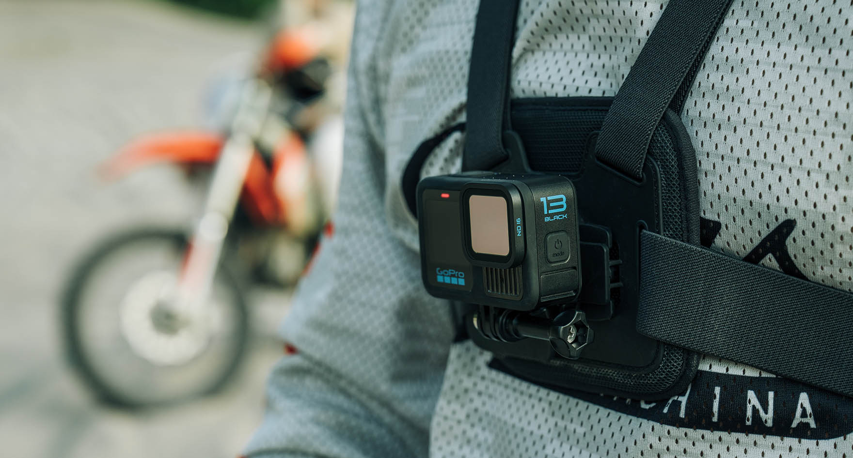Action Cams, wie die neu wie die hier auf einem Brustgurt befestigte GoPro Hero12für ein Motocross-Parkour ermöglichen Video bei (actionreichen( Tatigkeiten