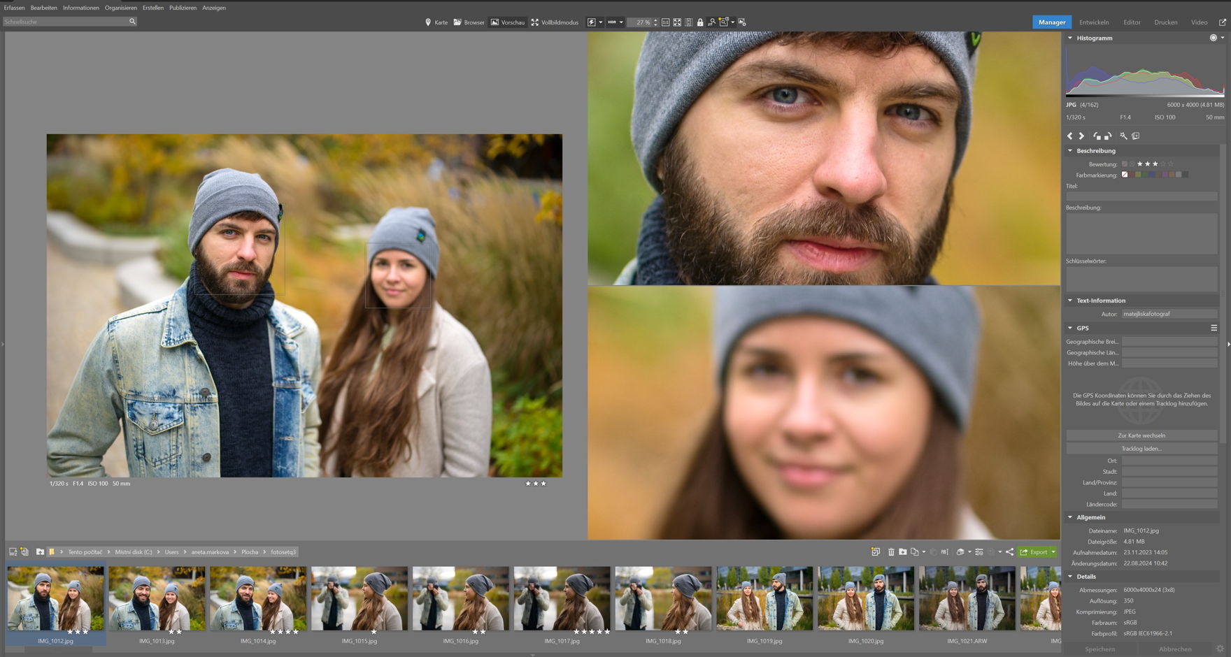 Auswahl eines Fotos mit den besten Details dank AI-Vorschau: Das Programm nutzt AI, um Gesichter in Fotos zu erkennen und eine detaillierte Darstellung aller Gesichter auf dem Foto anzuzeigen. Somit geht das Finden eines Bildes, auf dem niemand blinzelt und die Gesichter scharf sind, deutlich schneller und einfacher.