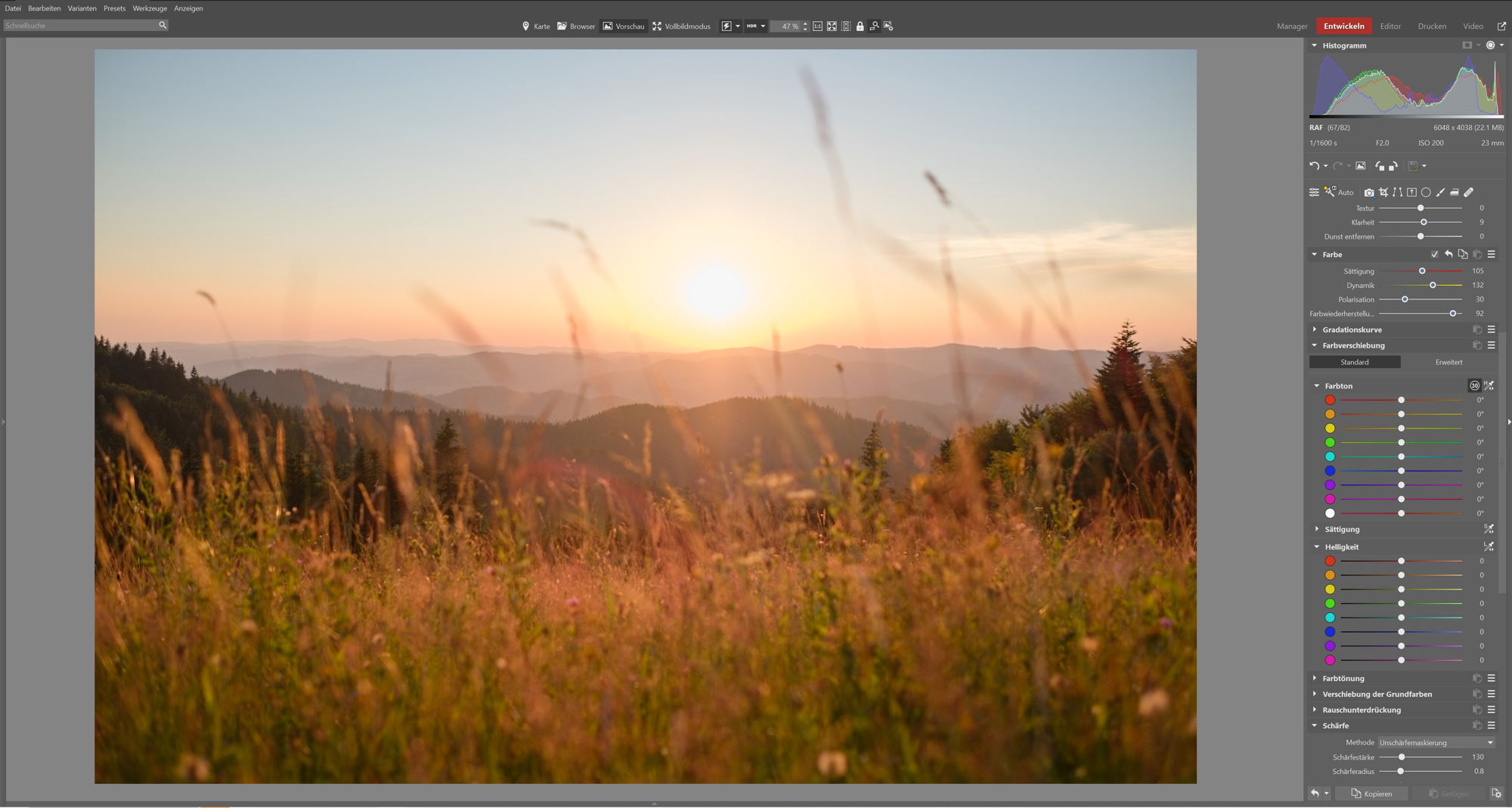 Verbesserter Verarbeitungsprozess für eine hohe Qualität der Ergebnisse: Das Programm bringt mit dem Herbst-Update 2024 eine neue Version der Verarbeitung von Aufnahmen im Modul «Entwickeln» mit. Verbessert wurde die Verarbeitung von Überbelichtungen und Belichtungsparameter (Lichter, Schatten, Kontrast usw.). Darüber hinaus wurde dem Modul «Entwickeln» der neue Parameter «Farbwiederherstellung» hinzugefügt, mit dem das Verhalten von Farben im Bereich der Überbelichtungen beeinflussen.