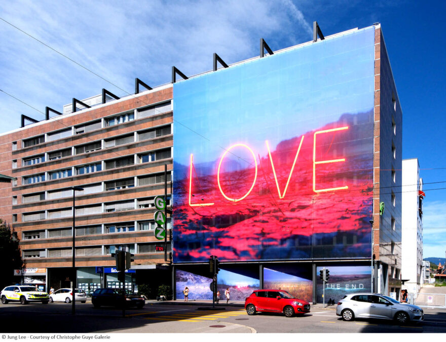 Jung Lee ist bekannt für ihre Fotografien von Neontext-Installationen in den verschiedenen Landschaften Südkoreas. Indem sie sentimentale Aussagen mit strengen Orten kontrastiert, schafft sie emotional aufgeladene Botschaften. Inspiriert von Roland Barthes‘ Essay «Fragments amoureux» aus dem Jahr 1977 analysiert die Künstlerin den intensiven Zustand des unbeantworteten Verlangens, der die totale Liebe zu einem Geliebten symbolisiert und ihn in tiefe Einsamkeit stürzt. «Love» beherrscht die Szenerie mit ikonischer und idealisierter Präsenz. Die monumentale Installation erforscht einfühlsam dieses essentielle und universelle Gefühl.