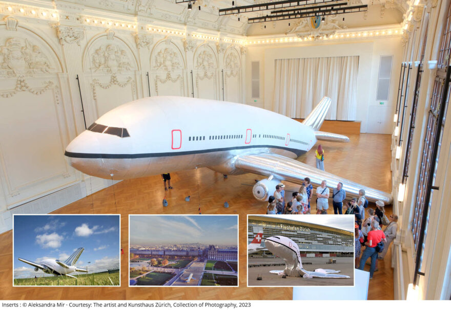 Originell ist die Installation von Aleksandra Mir und gekonnt sind die Aufnahmen, die sie von dem gigantischen Ballon in Form eines Verkehrsflugzeuges realisiert hatte. Die Künstlerin beauftragte eine Spezialfirma mit der Herstellung des 20 Meter langen Gebildes mit einer Spannweite von 15 Metern, den sie mit Helium gefüllt an verschiedensten Locations für ihre Aufnahmen platzierte. Seit mehr als 20 Jahren «landet» mit diesen Giganten, der leichter als Luft ist, in verschiedenen Ländern und an ikonischen Orten und fotografiert diese unwahrscheinlichen und poetischen Landungen. 2023 erwarb das Kunsthaus Zürich dieses monumentale Werk und organisierte auf Einladung der Biennale Images Vevey eine weitere Landung.