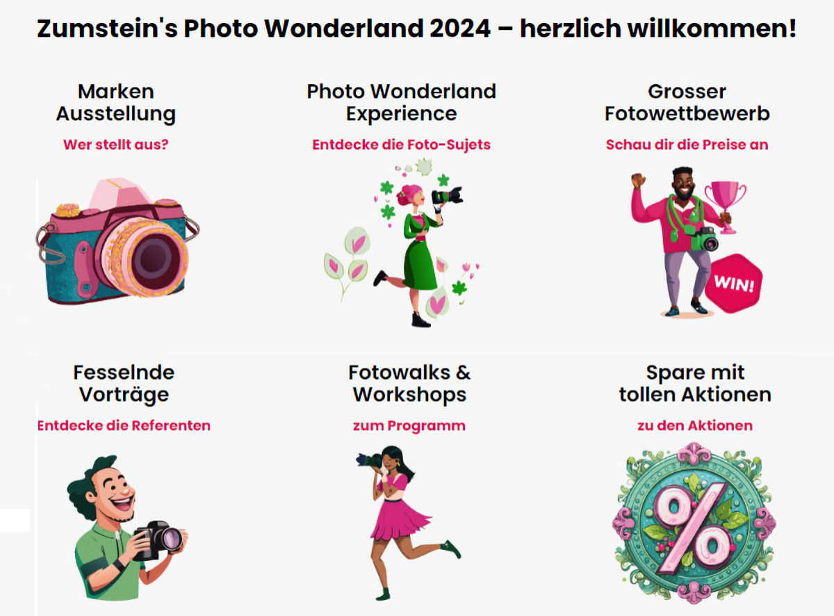 Selbstverständlich bietet das «Photo Wonderland» am Freitag 25. und Samstag 26. Oktober 2024 auf dem Casinoplatz in Bern die Highlights anderer Jahre, wie die Marken-Ausstellungen mit allen Fotoneuheiten, den Vorträgen und Fotowalks oder dem verlockenden Fotowettbewerb. Doch damit nicht genug. Foto Zumstein hat sich einiges mehr für ihre «zwei schönsten Tage im Jahr» einfallen lassen. So gibt es in der «Wonderland Experience» viele Fotomotive und das Knowhow dazu, wie man diese am besten ablichtet, es gibt neue und spannende Kurzworkshops oder man kann von vielen Aktionen profitieren. Hier das ganze Programm: