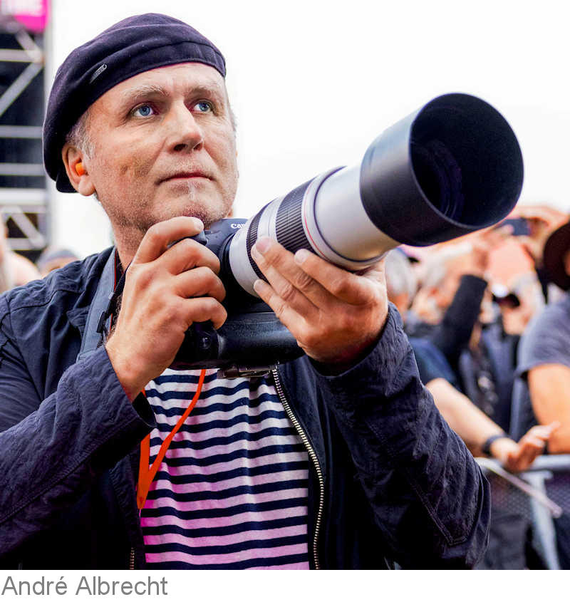 André Albrecht ist seit über drei Jahrzehnten als Fotograf in den Bereichen Presse, Dokumentation und Werbung tätig. Er war mit Franz Gloor gut befreundet und in seinen jungen Jahren war Gloor eines seiner Vorbilder. In seinem Arbeitsalltag fotografiert Albrecht oft an Musik-Festivals, aber auch an kleineren Konzerten und Aufführungen. So hatte er schon die Rolling Stones, AC/DC oder aktuell Nemo und andere Schweizer Musiker und Künstlerinnen wie Stress, Stefanie Heinzmann oder Oesch’s die Dritten vor der Linse. Man sagt dem leidenschaftlichen Fotografen und Musikliebhaber nach, dass man auf seinen Fotografien die Musik quasi «höre». Seine Bilder werden oft von den Musikern und Musikerinnen auf ihren Websites oder Social Media Kanälen verwendet und in Zeitungen und online veröffentlicht.