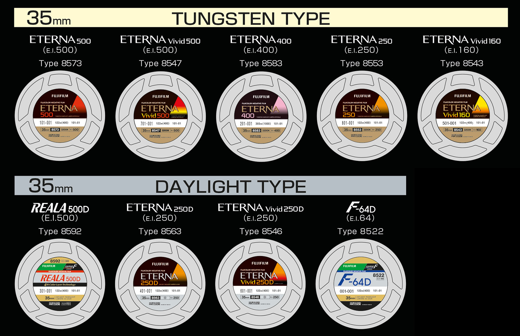 Namensgebend für die geplante Kamera ist der einstige «Eterna»-Cinema-Film, der seit der X-H1 als Filmsimulation (Bildstil) weiter in GFX- und X-Kameras existiert. Diese Übersicht zeigt die 35mm-Cinema-Farbnegativfilme von Fujifilm im Jahr 2010. Von den insgesamt neun Cine-Filmen liefen sieben unter dem Markennamen Eterna.