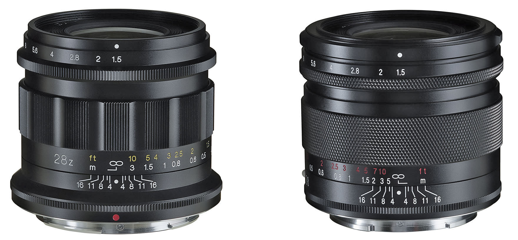 Voigtländer Nokton 28mm f1.5: Version mit Z-Mount (links) und E-Mount-Variante (rechts). Bei der Nikon-Variante orientiert sich das Design des Fokus an Nikon-Objektiven der 1960er. Die «Schürze» am Bajonett ist bedingt durch den grossen Durchmesser des Z-Bajonetts.
