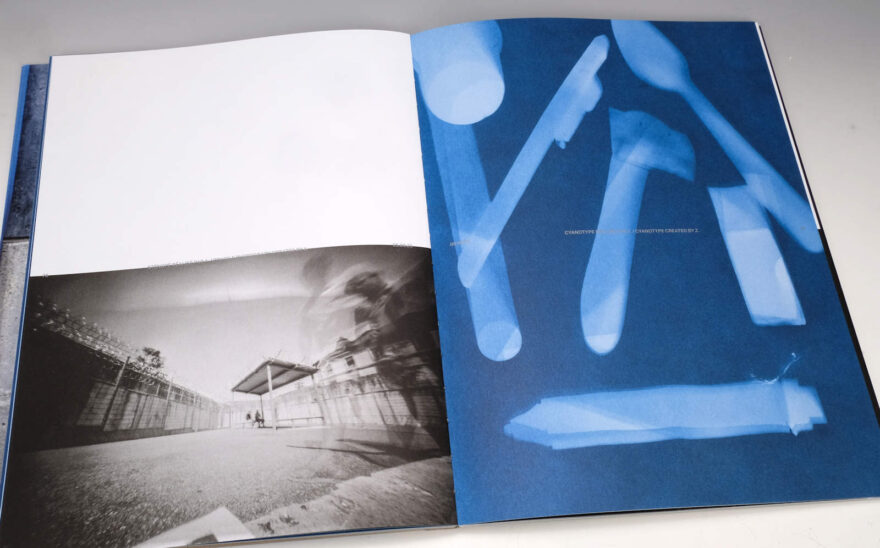 Dazwischen entdecken wir 34 fotografische Impressionen, auf mattem Papier deutlich vom übrigen Buchinhalt abgehoben, welche das Umfeld der Inhaftierten und den harten Beton als ihren Horizont zeigen, Bilder, welche den Betrachtenden auch Freiraum zur persönlichen Interpretation lassen und nicht nur Fragen beantworten, sondern, mehr noch, auch solche stellen. Einige der Bilder beschränken sich auf die Gefängnismauern und Zellen, in denen die verurteilten Menschen ihren Alltag fristen, andere zeigen einfache Gegenstände, wie Brille, Löffel oder Kugelschreiber, die für die Insassen zu lebenswichtigen Objekten geworden sind. So ist ein fotografisches Experiment entstanden, das neben dem gestellten Thema auch eine hohe Kreativität der Fotografierenden beweist mit Bildern, die nicht nur einen dokumentarischen, sondern auch einen sehr hohen künstlerischen Wert darstellen.