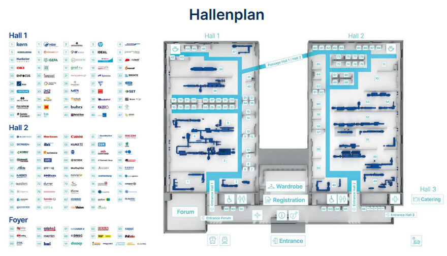 Die Messe findet in der Messe Luzern in der Allmend statt, wo sie drei Hallen belegt, zwei für die Präsentation der zum Teil gigantischen Druckanlagen und eine für die Verpflegung der Besuchenden. Rund 120 Aussteller aus aller Welt sind an der Messe präsent, die in den vier Tagen von Montag bis Donnerstag 27. Februar 2025 mehr als 6500 Fachbesucher und Interessierte erwartet.