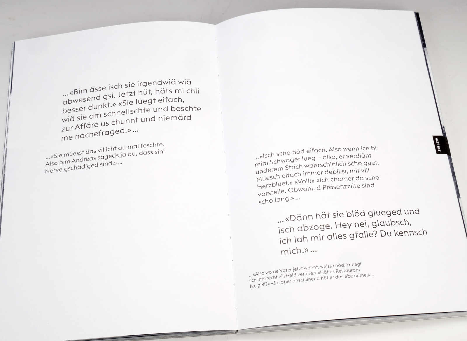 Das Ende jeder Bildreihe schliesst eine Textseite mit Zitaten ab, die Nadia in der entsprechenden Stadt aufgeschnappt hat. «… s’Ässe isch ächt guet gsi.’ ‘Würkli? Ich han ghört es seg zimli tüür.’ ‘Scho, isch nöd ganz billig, aber was wotsch. Hät sich glohnt’ …» Die Zitate sind banal, belanglos und haben keinen direkten Bezug zu den Bildern. Aber im Dialekt und im Ausdruck sind sie typisch für jene Stadt. Aufgeschnappt eben …