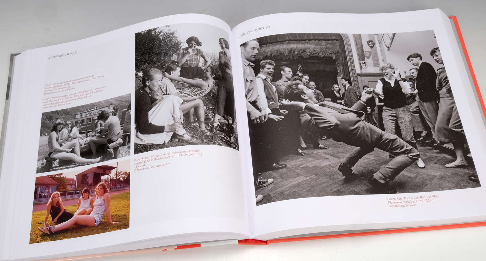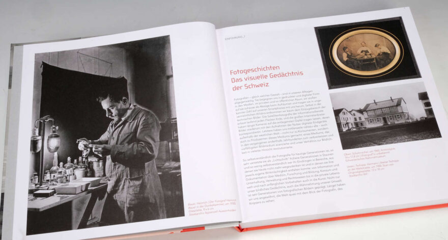 Der Bildband ist ebenso eine Zeitgeschichte wie eine Fotogeschichte. Das Bildmaterial deckt von frühesten Fotografien (Isenring Gruppenbild 1839, Seite 105) bis Ende des letzten Jahrhunderts alle Zeitepochen ab und wartet dabei mit vielen Neuentdeckungen auf. Es sind Bilder, welche themenbezogen ihre Geschichten erzählen – Fotogeschichten, eben – und Bilder, welche das Zeitgeschehen spannend und charakteristisch dokumentieren. Einige besondere Rosinen werden die Lesenden in den Kapiteln «Urbane Welten», «Industrie und Arbeitswelt», «Schweizer Traditionen», «Kunst und Fotografie» sowie in «Luftaufnahmen und zivile Luftfahrt» mit Bildern vorfinden, die typisch für unser Land und unser soziales Leben sind. Sämtlichen Kapiteln stehen informative Texte voran, welche in das jeweilige Thema einführen und wichtige Hinweise auf das Zeitgeschehen und themenbezogen auf die Bedeutung der Fotografie eingehen.