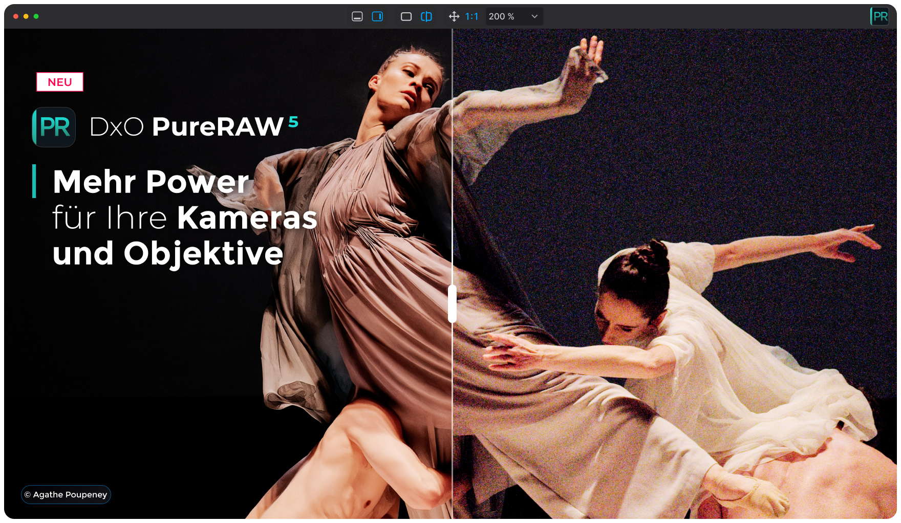 - Neue Technologien: DxO PureRAW 5 enthält die neue «DeepPRIME 3»-Technologie mit verbesserter Demosaicing und Rauschminderung sowie die Korrektur der durch eine Objektiv entstehenden chromatischer Aberrationen auf Pixelebene.