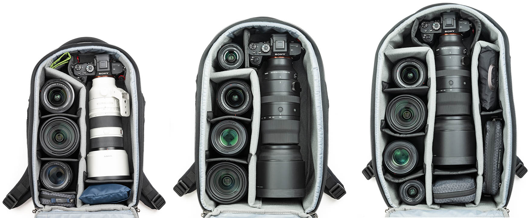 Die Rucksäcke sind so tief, dass professionelle Kameragehäuse mit montiertem Batterie-Hochformatgriff oder hohe Profikamera (mit integrierten Griff) samt Objektiv hineingelegt werden können. Für Ergonomie und Tragekomfort sorgen die optimal geformten, doppelt gepolsterten Tragschultergurte und die leicht gebogene, an den Rücken der meisten Körpertypen angepasste Rückseite der Rucksäcke. Optimal platzierte atmungsaktive Polster auf der Rückseiten unterstützen der Tragkomfort.