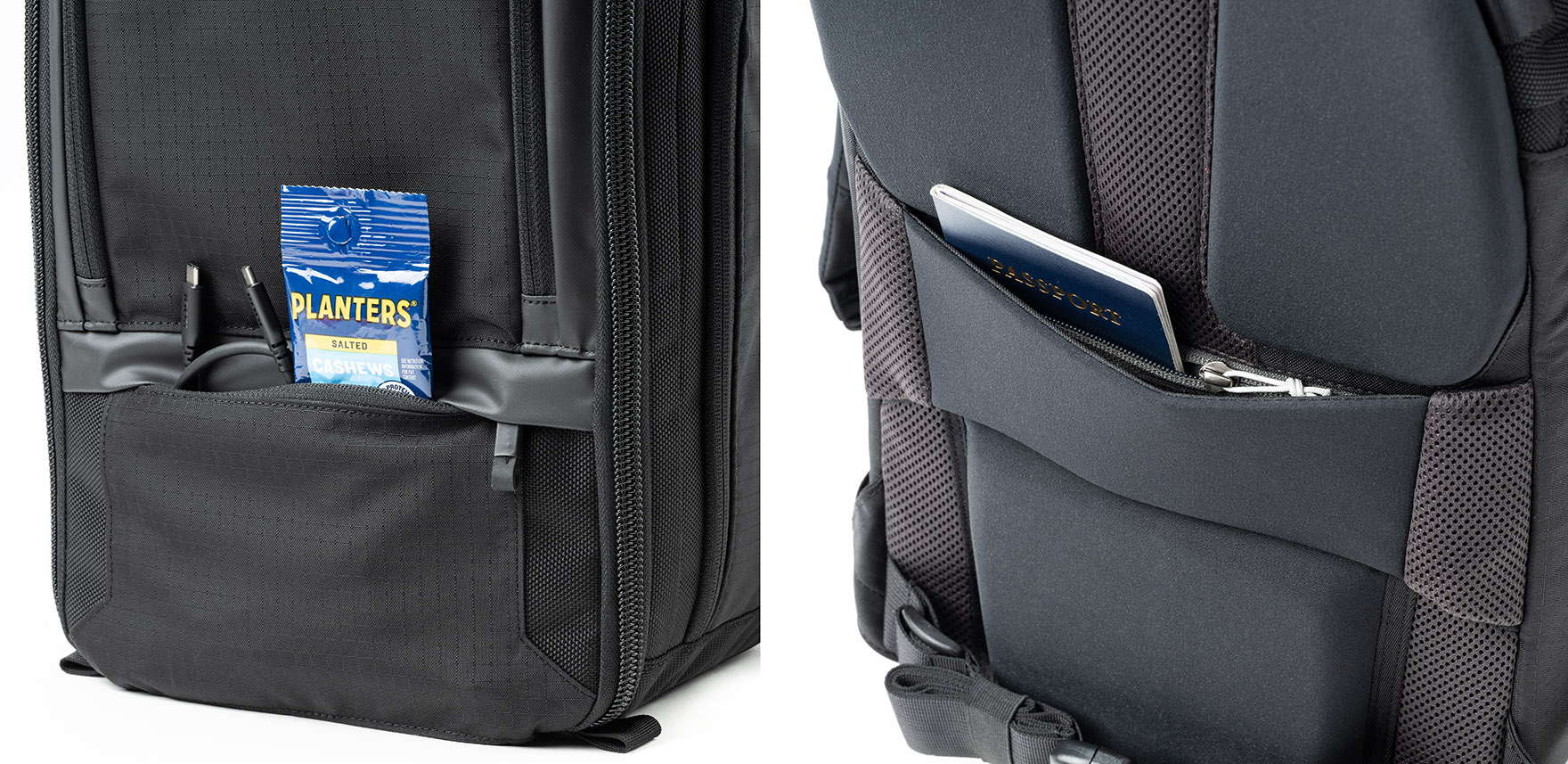 Links das untere Aussenfach auf Vorderseite des Rucksacks, rechts das versteckte Fach (z.B. für Reisepass) auf der Rückseite, die dem Rücken des Trägers zugewandt ist.