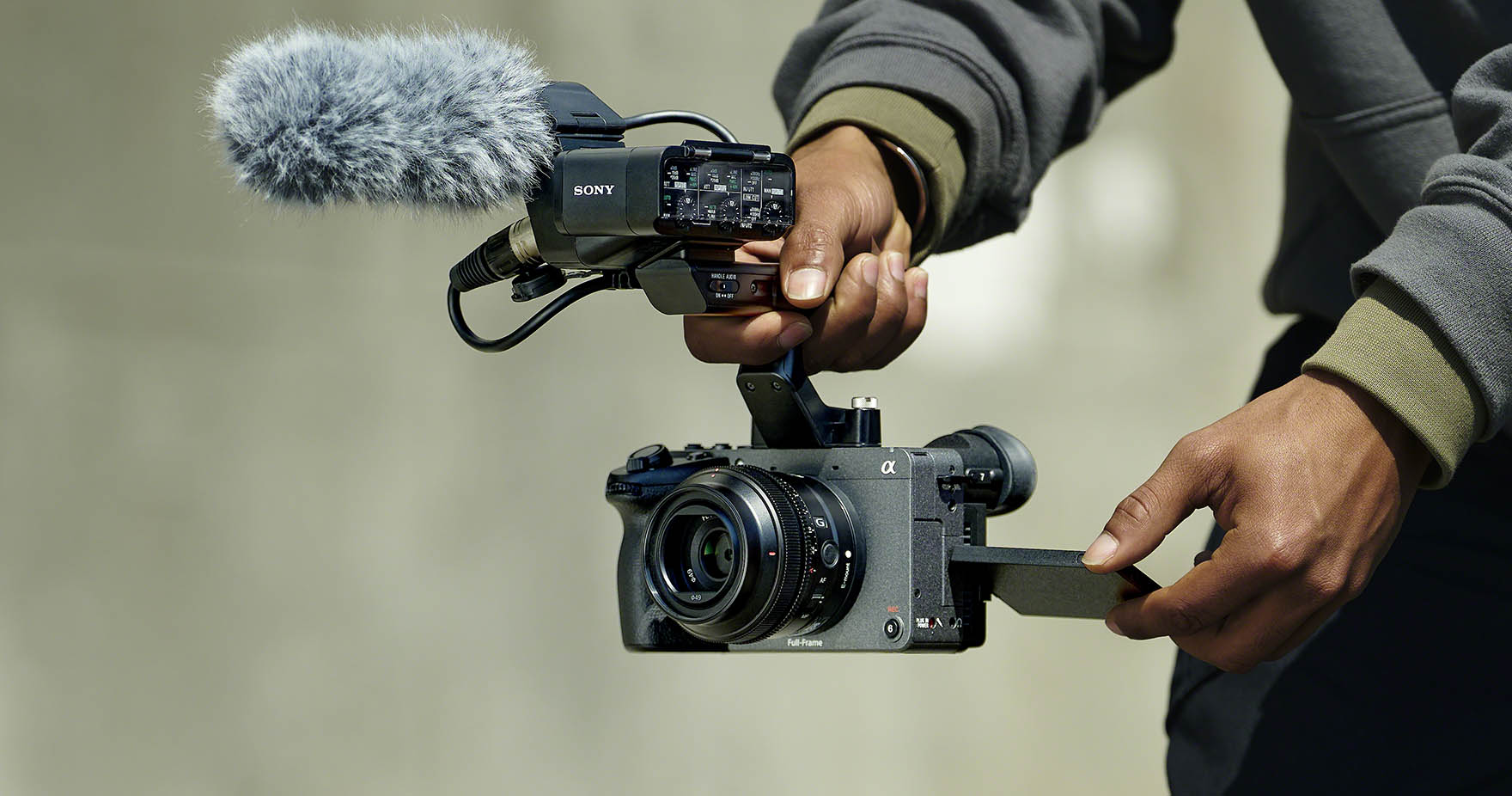 Die Sony FX2 ist das neueste Mitglied der Cinema Line-Familie. Hier ist mit Obergriff, Mikrofon und ausgeklapptem LCD abgebildet.