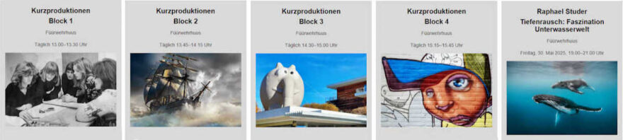 Die audiovisuellen Produktionen werden jeden Nachmittag im Füürwehrhuus [13] auf einer Grossleinwand präsentiert. Es sind jeweils vier bis fünf audiovisuelle Werke pro Block, die zusammen 30 Minuten dauern.