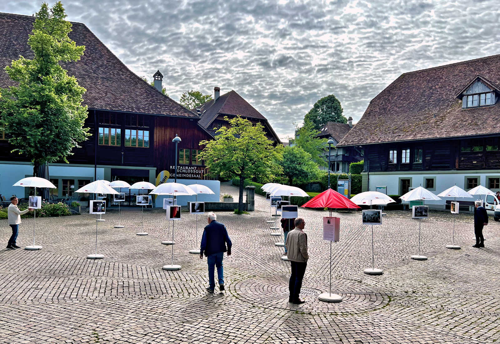 Der Schlossgutplatz, mit den typischen Photo Münsingen-Regenschirmen, ist ein beliebter Treffpunkt und Begegnungsort