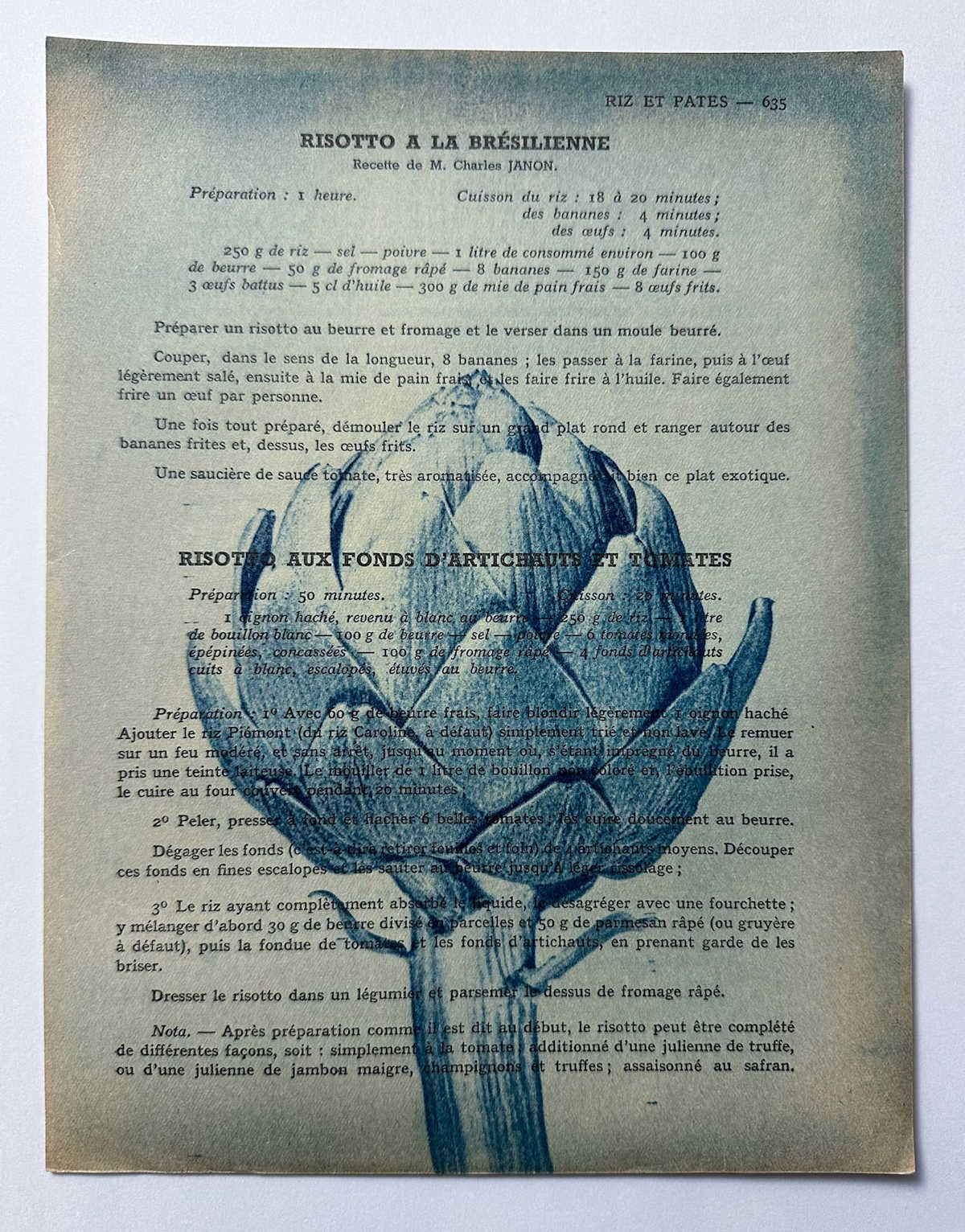 Maud Lecornier His hat es geschafft, ihre beiden Leidenschaften, das Kochen und die Fotografie, miteinander zu verbinden. Um die Veröffentlichung ihres Kochbuchs «Sie werden immer etwas zu bemängeln finden!» zu begleiten, hat sie eine Fotoserie geschaffen, die sie selbst im klassischen Cyanotypie-Verfahren auf Auszügen auf alten Kochbüchern entwickelt hat. Jedes Foto wurde sorgfältig ausgewählt, um mit einer bestimmten Seite zu verschmelzen.
