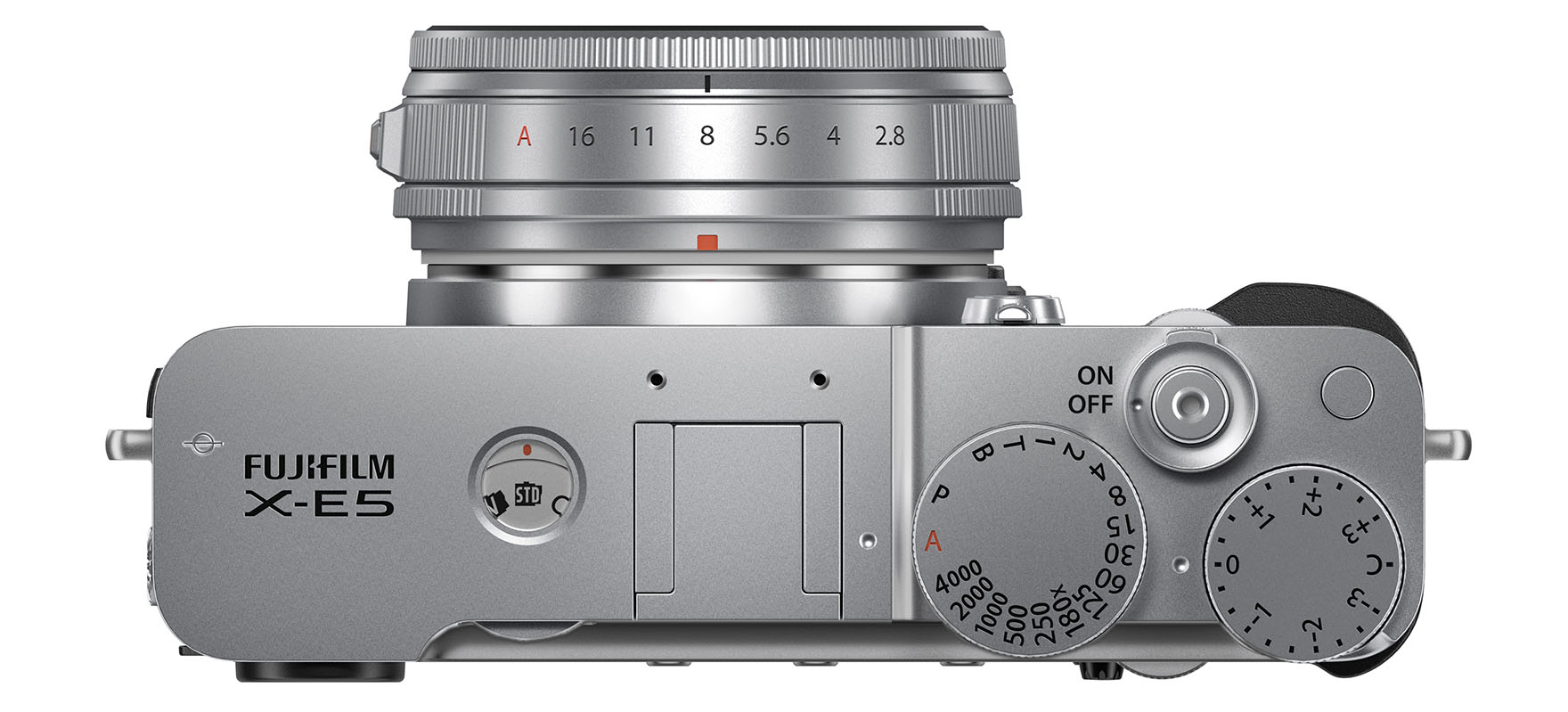 Die Oberseite der Fujifilm X-E5 mit dem brandneuen Pancake XF23mmF2.8: Neu designt ist das Filmsimulationsrad, das sich links oben auf der Rückseite befindet, aber auf der Kameraoberseiten die eingestellte Filmsimulation anzeigt.