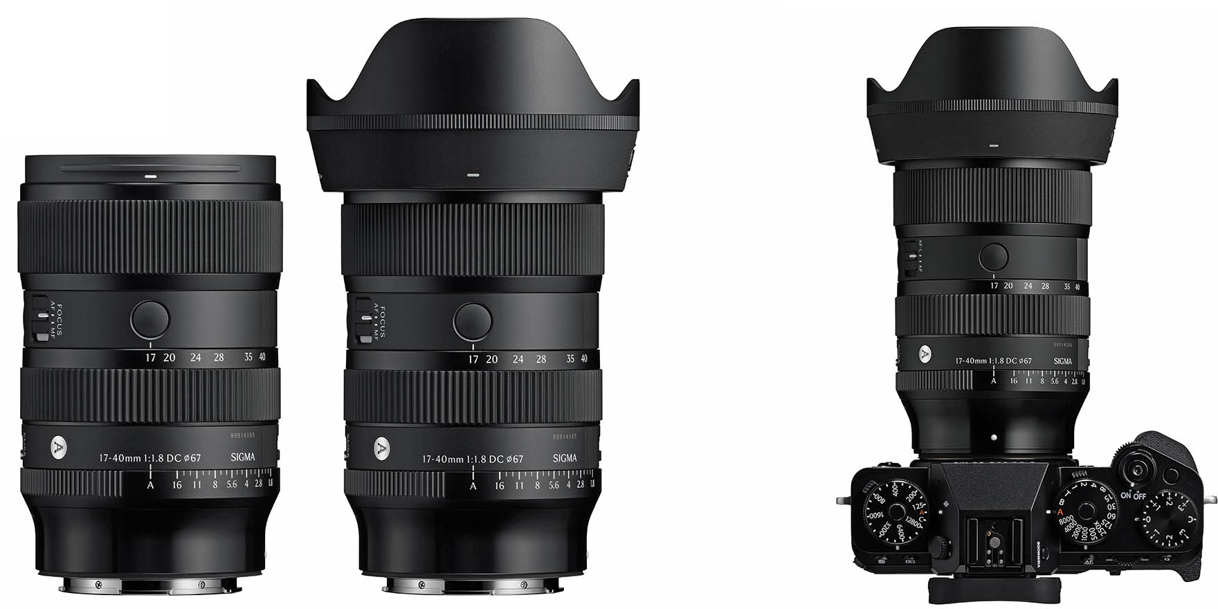 Das 1,8/17-40mm: mit L-Mount links ohne und mit Gegenlichtblende, rechts eine X-Mount-Variante an einer Kamera von Fujifilm