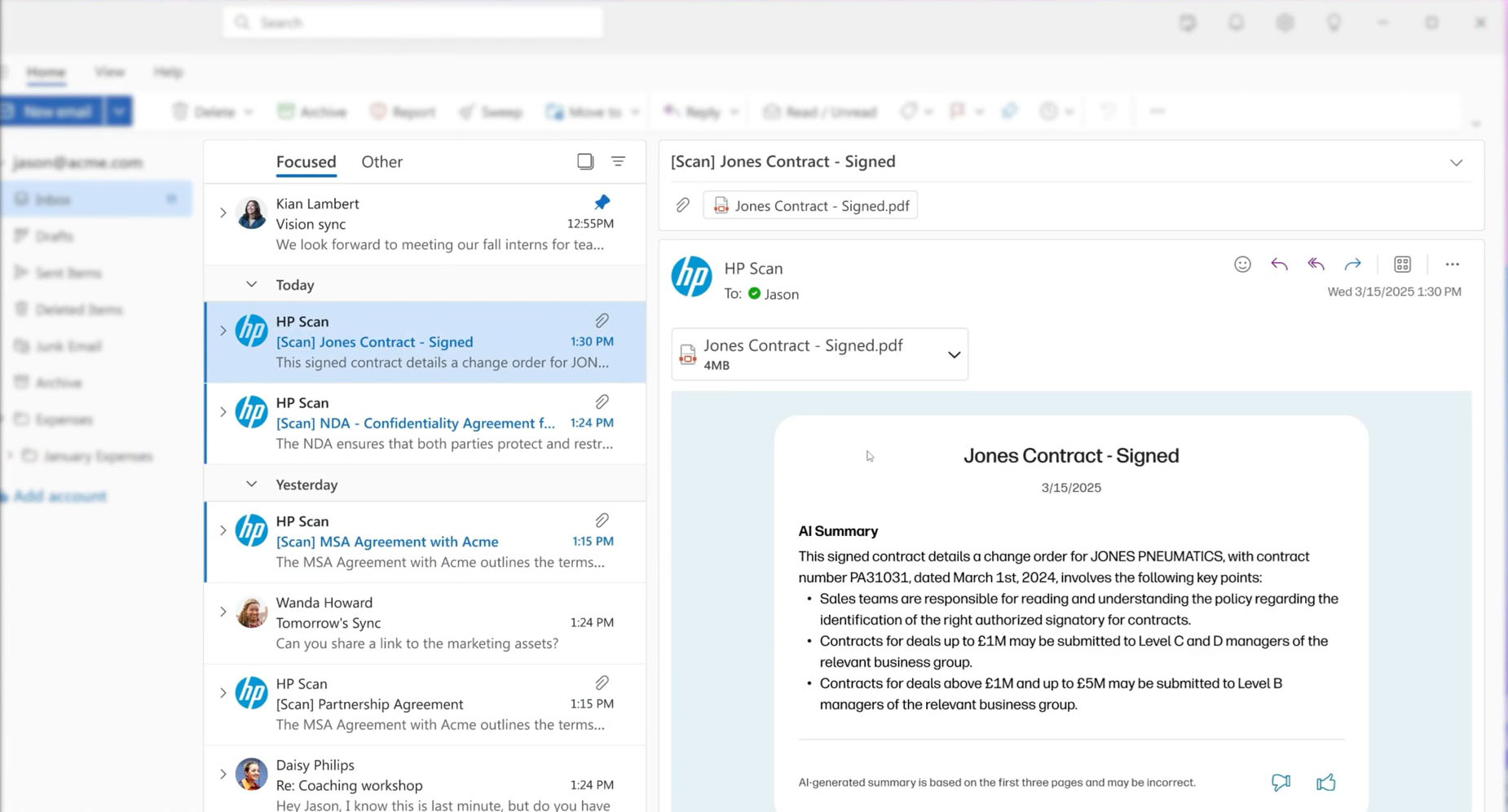 Nutzer sind so in der Lage, Aufgaben schneller und mit weniger Aufwand zu erledigen. Darüber hinaus verwendet eine neue Scan-to-E-Mail-Funktion, die im Oktober 2025 eingeführt wird, KI, um den Inhalt von gescannten Dokumenten zusammenzufassen und eine E-Mail mit der bereits angehängten Datei zu erstellen, die per E-Mail oder Chat versendet werden kann.