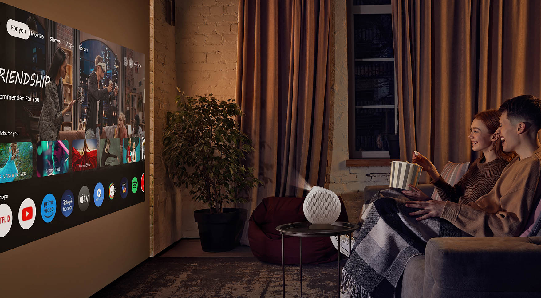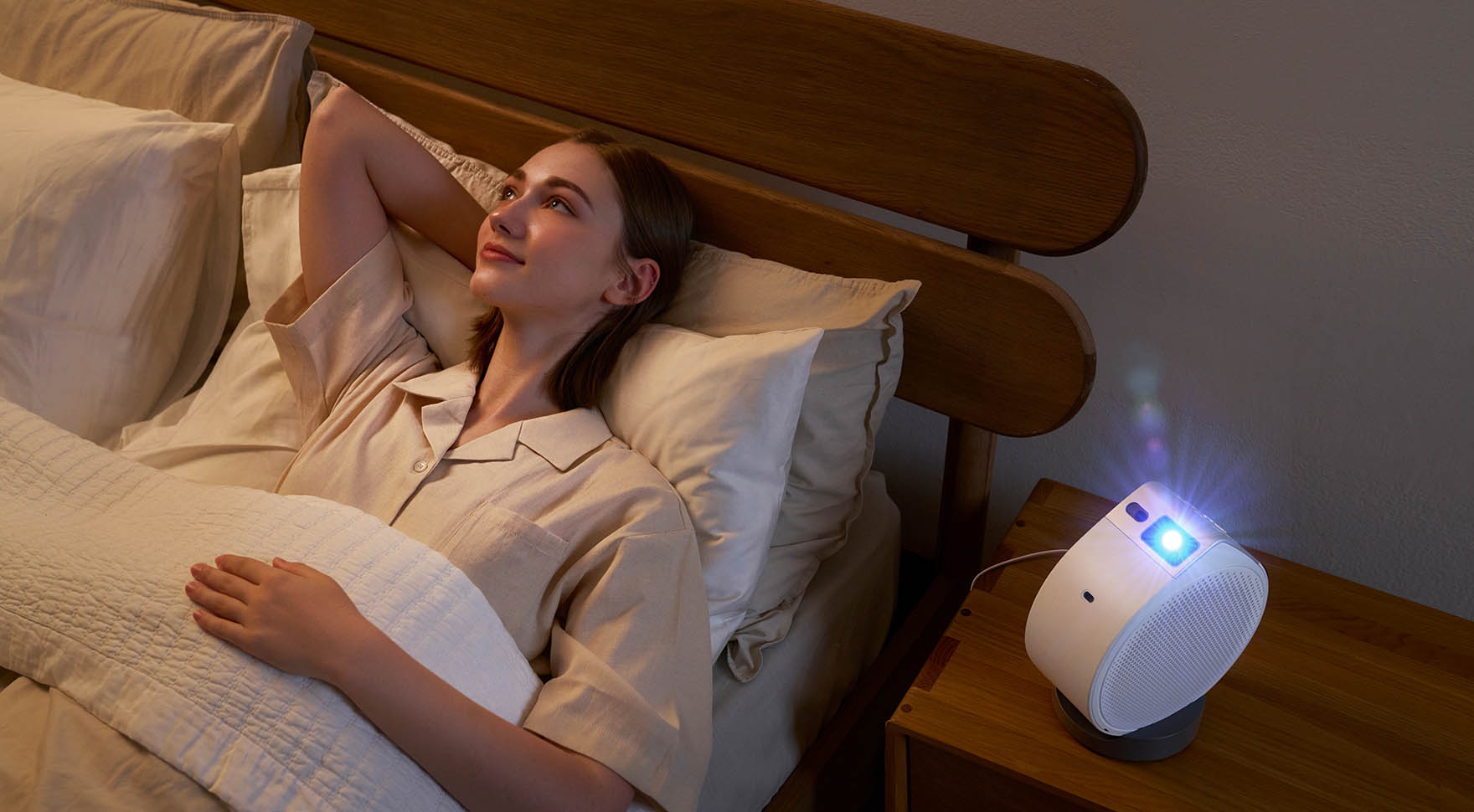 Er ist ein stylischer, mobiler Mini-Beamer fürs Entertainment, der auch an die Decke projizieren kann
