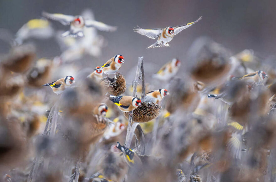 «Ungemähte Sonnenblumen, voller kalorienreicher Samen, lockten fast 10 000 Stieglitze an. Ich hatte noch nie so viele an einem Ort gesehen. Versteckt zwischen den vertrockneten Stielen verbrachte ich über zwei Wochen damit, darauf zu warten, dass sich die Stieglitze näherten. Dies ist eines meiner Lieblingsfotos aus der Serie, das eine Gruppe von Stieglitzen beim Fressen zeigt, während im Hintergrund weitere Vögel herbeifliegen.» Mateusz Piesiak.