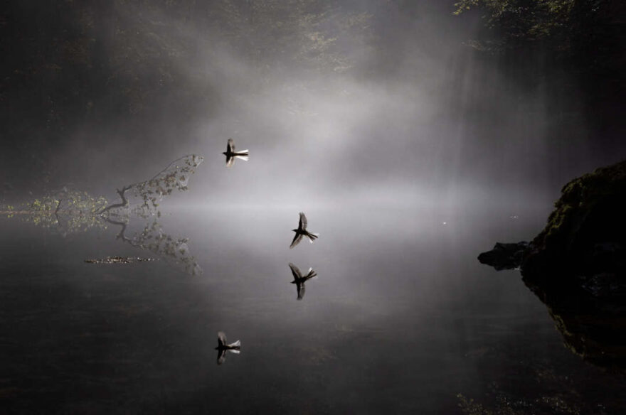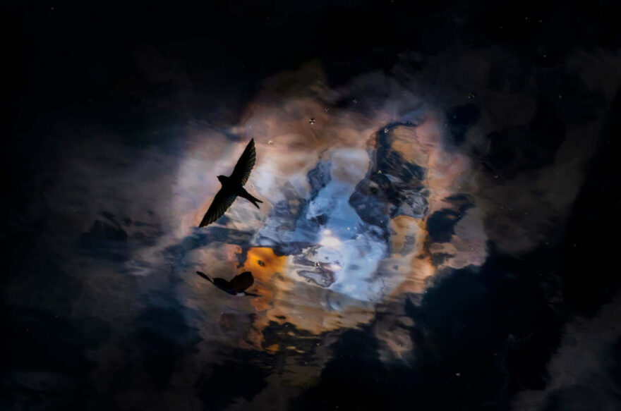 «Über einem Fluss zogen die Mehlschwalben in rasantem Tempo ihre Kreise, jagten dicht über der Wasseroberfläche nach Insekten und vollführten dabei blitzschnelle Wendemanöver. Von meiner erhöhten Position konnte ich sie mit starker Unterbelichtung fotografieren, sodass sie nur noch als schwarze Silhouetten direkt vor der sich im Wasser spiegelnden Sonne erschienen.» Luca Lorenz.