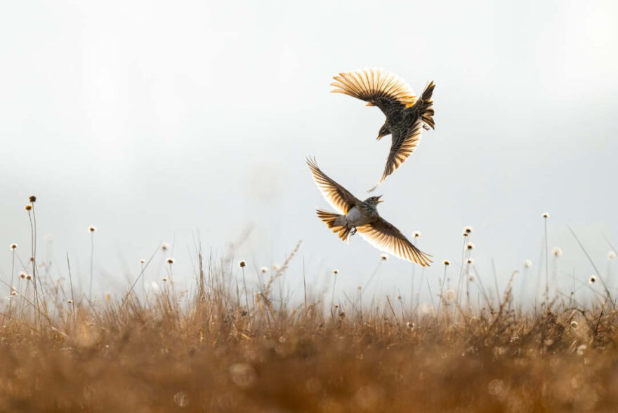 «An einem klaren Märzmorgen im polnischen Barycz-Tal stürzten sich zwei Feldlerchen in einen heftigen Luftkampf um ein Revier. Diese Luftkämpfe sind voller Energie und Emotionen, doch sie festzuhalten ist eine Herausforderung, da sie schnell und unvorhersehbar sind. Seit Jahren kehre ich zu dieser Wiese zurück, geniesse die Aussicht und versuche, den perfekten Moment im Flug einzufangen.» Michał Michalski.