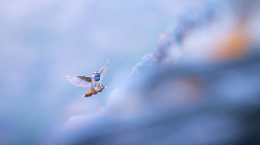 «In einem Hochtal der Schweizer Alpen wurde ich auf ein Brutpaar des Rotsternigen Blaukehlchens aufmerksam. Das Männchen startete dabei mit wiederholten Singflügen von einem steinernen Hausdach. Als es zur Landung ansetzte, löste ich aus. Der charakteristische rostrote «Stern» und die blaue Kehle harmonierten perfekt mit den Farben der Umgebung» sagt Elias Brigger.